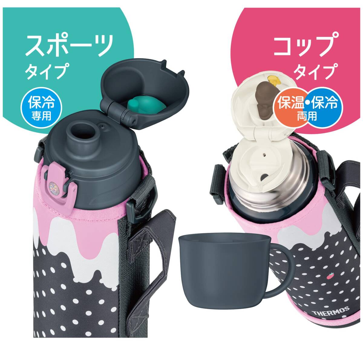 ・直接飲める保冷専用スポーツボトル、コップと中せんを付けて、保温・保冷対応のステンレスボトルにもなる2ウェイボトル。専用ポーチ付き
