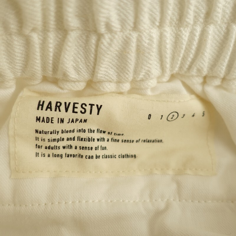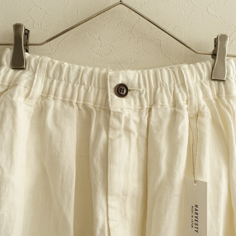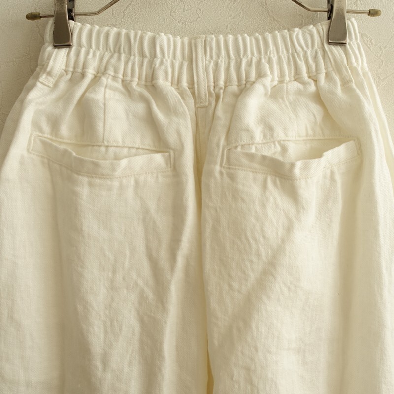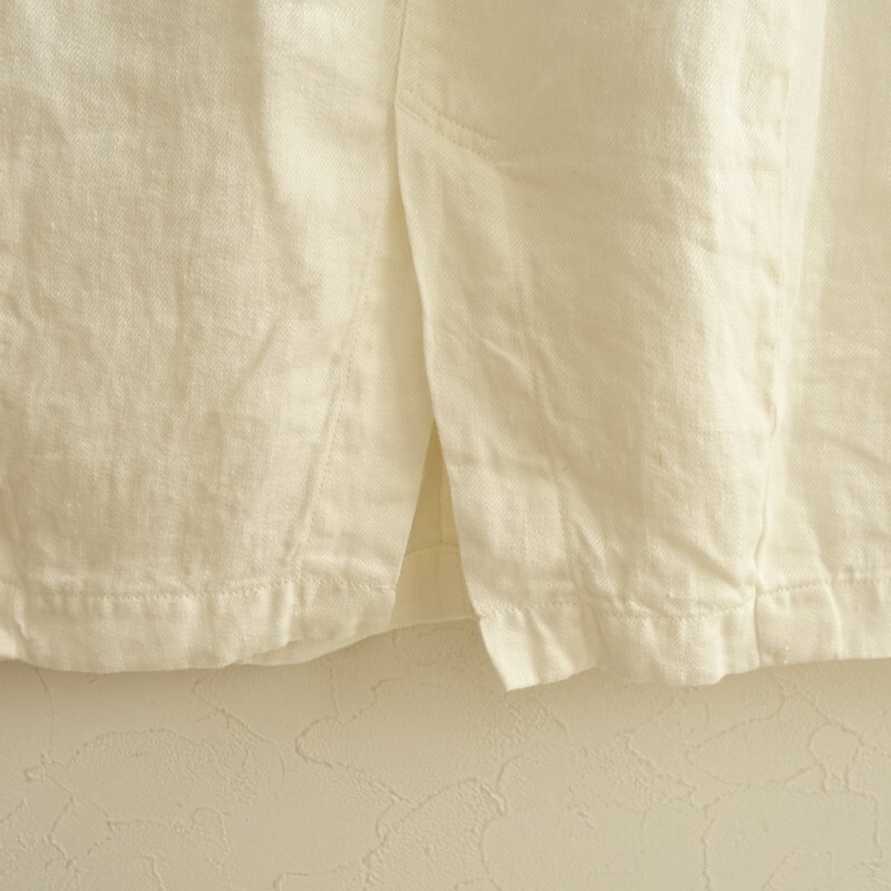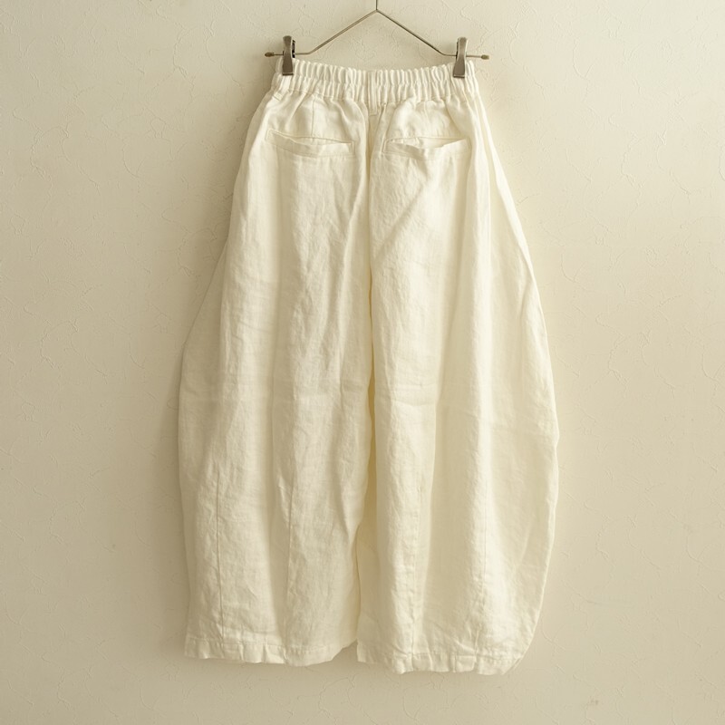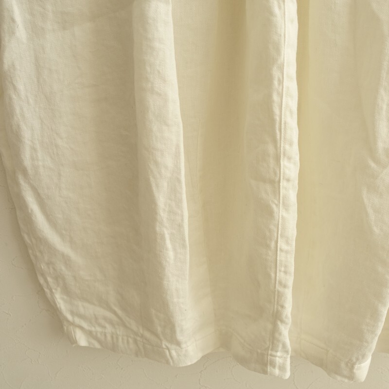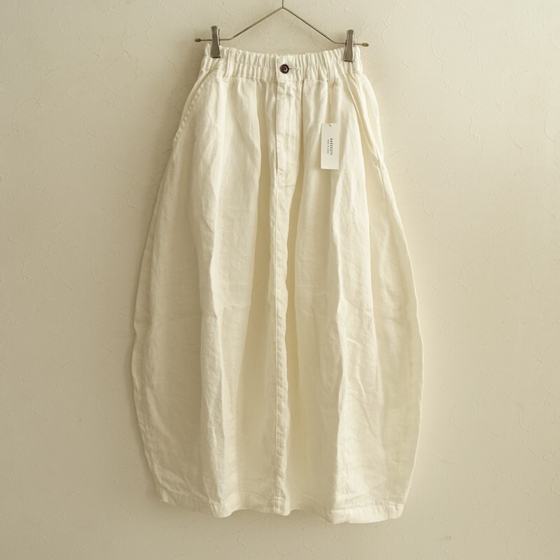 | 2025年コレクション HARVESTYのリネンチノサーカススカートです。カラーはオフホワイトです。麻特有の糸節・ネップ・艶などが見受けられるナチュラルな風合いのリネンツイル生地を使用。柔らかく、中厚で、少し透け感がございます。サーカスパンツのバルーン感をそのままデザインに落としたスカートです。前立てはジップフライ、ウエストはゴム入り、ベルトループ付きです。フロントにイン方向の2タック、裾にダーツを配した立体的なフォルム。バック裾にはセンターベント入り。ヒップに片玉縁ポケット、前両腰にハンドポケットがございます。定価(メーカー希望小売価格)26,400円の商品です。 |
