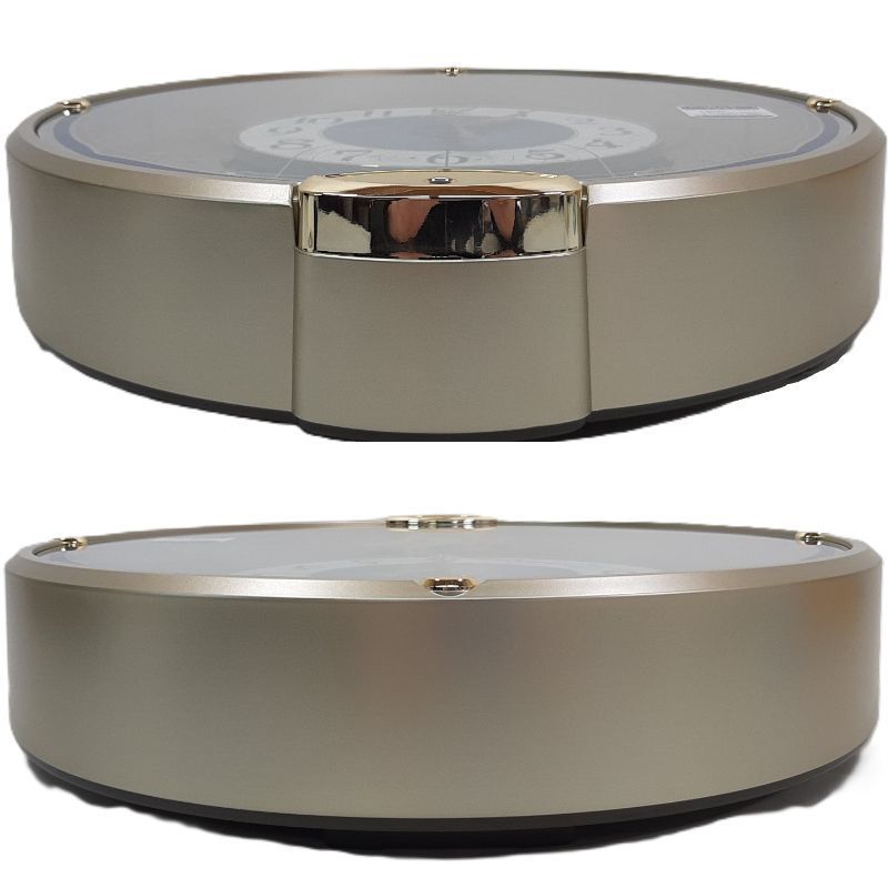 ①毎正時、オープニングの曲とともに文字板が左右に開き、中から現れたラッパの飾りがついたディスクが回転します。