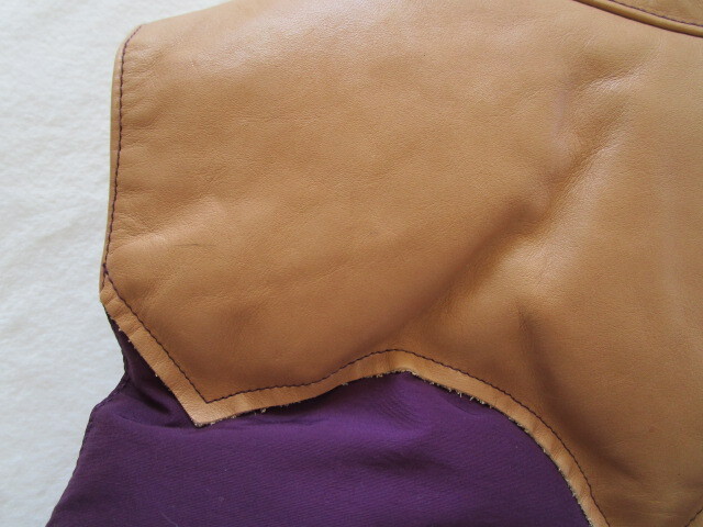 パープルの生地部分にも僅かですが白っぽい汚れがあります。右衿先のボアが左に比べて少し薄くなっています。