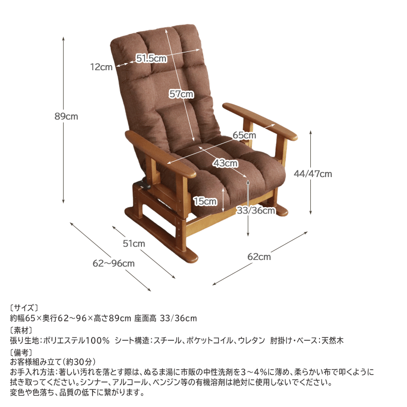 約幅65×奥行62~96×高さ89cm 座面高 33/36cm
