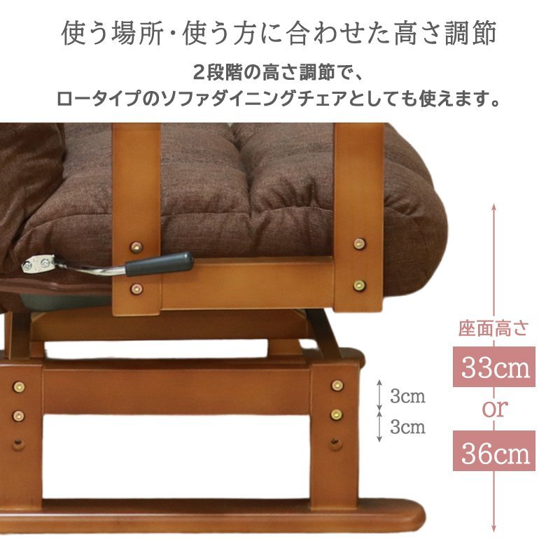 高さは、33cmと36cmの2段階に調整ができるので、リビングはもちろん、ソファダイニングやローダイニングチェアとしても使用できます。