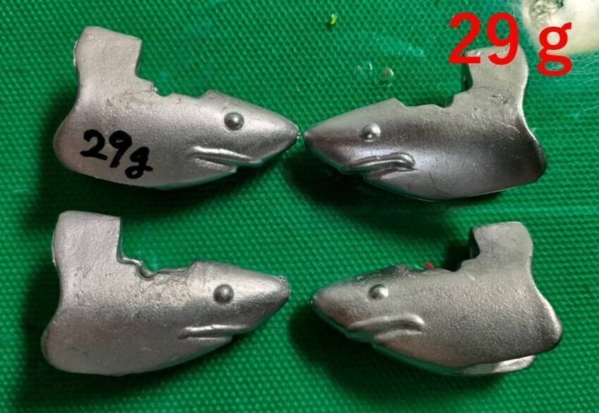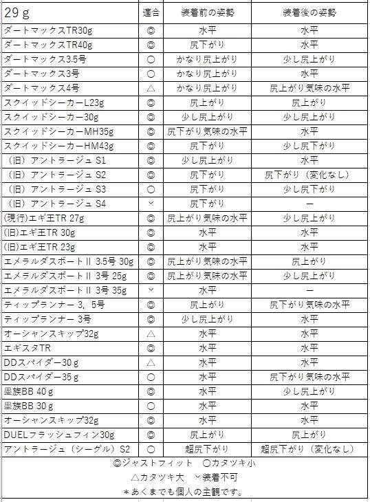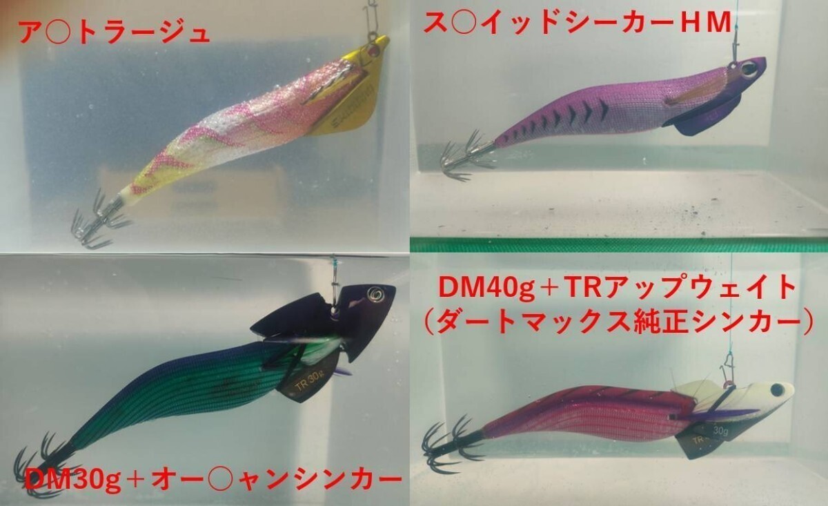 ところが、40g以上の重量級のエギやシンカー装着後の姿勢はメーカーでもあまり考慮されておらず、極端な尻下がりになる製品がかなり見受けられます。他社のシンカーを装着した場合は言わずもがなです。最近待望のダートマックス専用の純正シンカーが発売されましたがこれもバランスが良いとは言えませんね(9番目写真)。