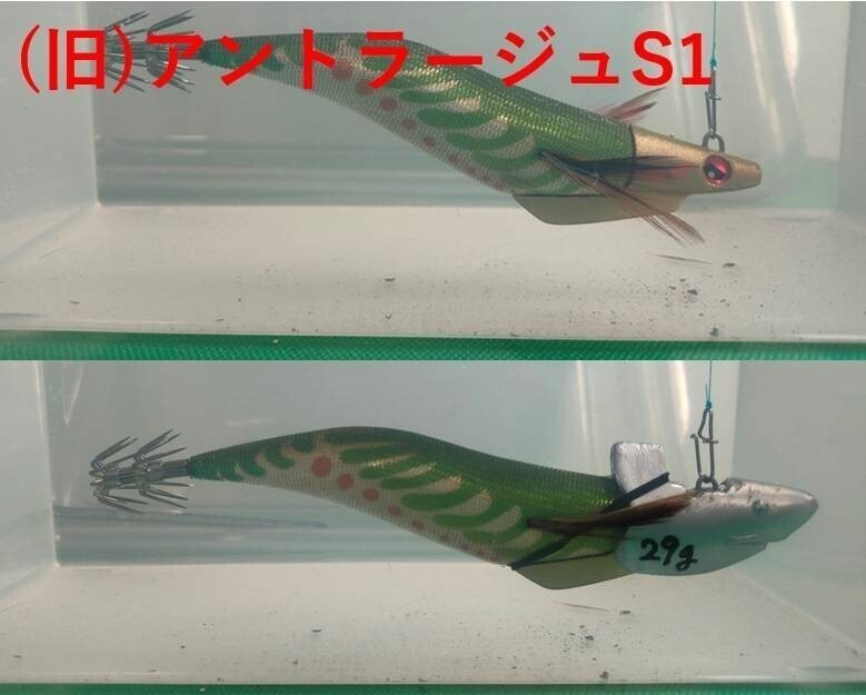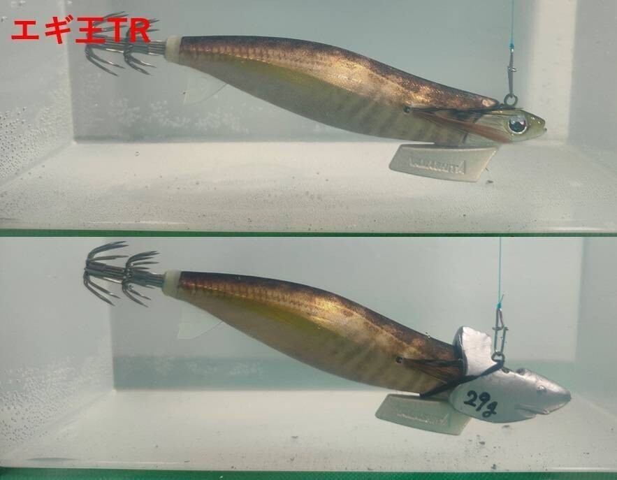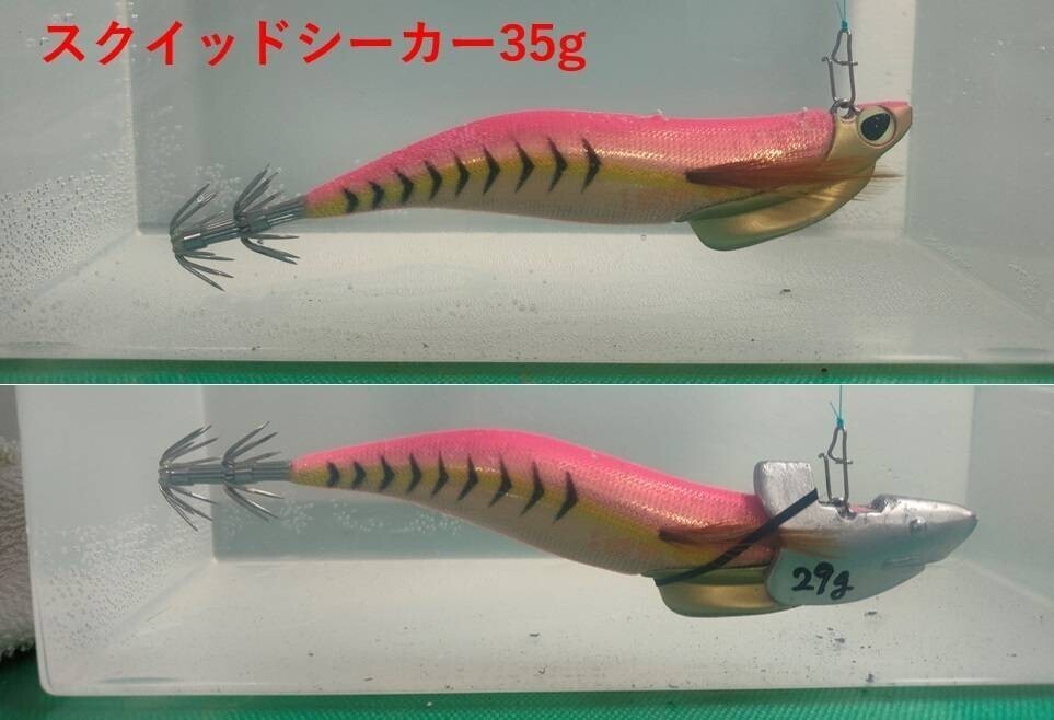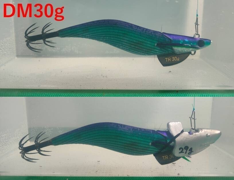 ご存じの方も多いと思いますが、水中でのエギの姿勢は非常に重要です。ステイ時にエギが水平姿勢を保っていないと釣果が格段に落ちます。このため各メーカーが販売している30g前後のエギは水平姿勢〜若干尻上がりの姿勢をとるものが大半です。