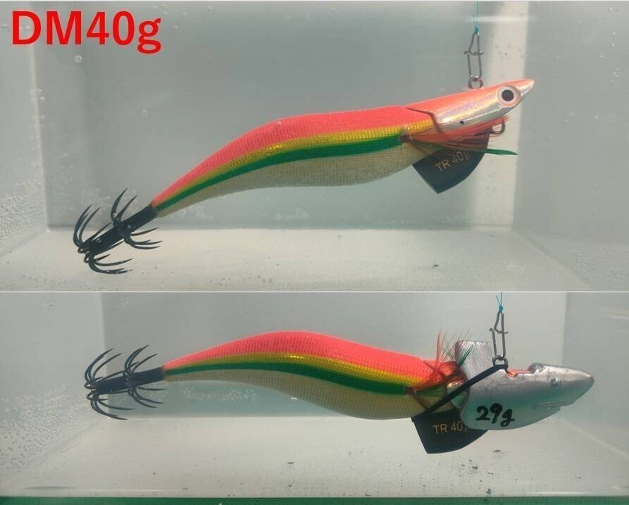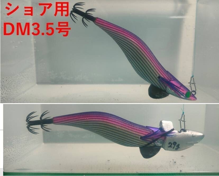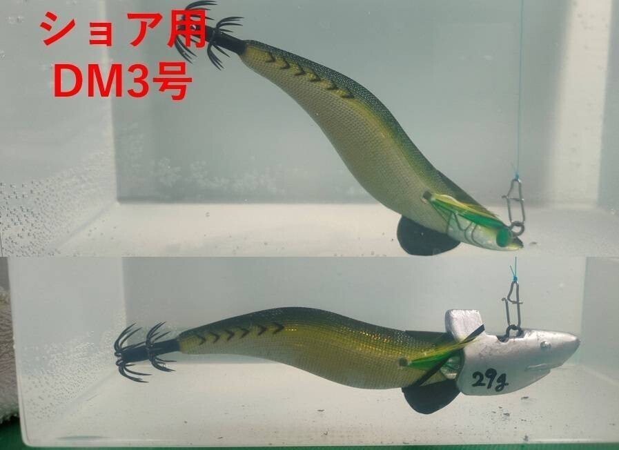DMショア用3.5号/3号…装着前はかなりの尻上がり。フォールで魅せるショアエギならともかく、水平移動が基本となるティップランではこの姿勢はよくありません。シンカー装着後はきれいな姿勢です。装着後はそれぞれ48g、46gです