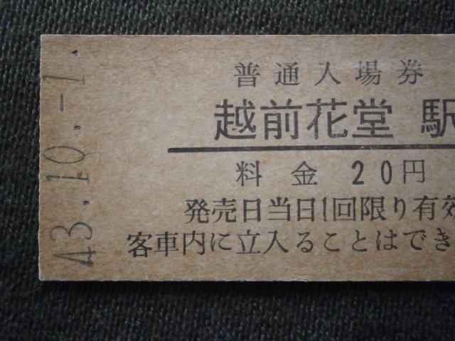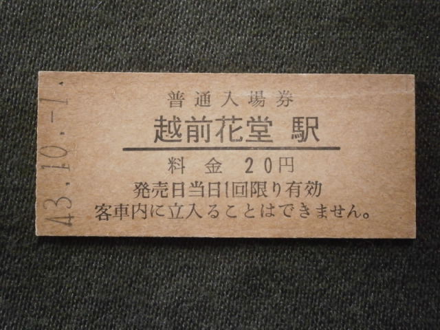 国鉄 開業初日 越前花堂駅 20円入場券(未使用)
