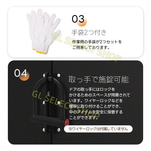 ◆01多用途に対応!あらゆる荷物をスマートに収納 マルチに活躍する収納庫。家の周りで散乱しがちな荷物をすっきり。 ゴミによるのカラスや猫のイタズラ対策にも最適です。 ◆02大容量2700L!広々スペースでたっぷり収納 2700Lの収納スペースをコンパクトにまとめ、庭や室内で場所を取る物品をきちんと片付けられます。 収納力は抜群で、空間を有効活用しながらすっきりとした生活環境を手に入れられます。 ◆03スマートなアクセス!引き戸式ドアで快適操作 開閉時にスペースを取らず、狭い場所でもスムーズにアクセス可能。 大きく開くドアで大型の荷物も簡単に出し入れでき、日常の収納がストレスフリーに行えます。 単扉ザイズ:156.5cm*35.5cm 両扉ザイズ:154cm*71cm ◆04快適な環境を保つ換気システム 上部には前後に2つずつの換気口が付いており、ルーバーの形状で雨水も入りにくく、空気を循環させて、室内の温度と湿度を快適に保ちます。 ◆05しっかりとした頑丈な素材 ハイテンション亜鉛メッキ鋼板採用! 有害物質が発生しない環境に配慮した粉体塗装仕上げで、衝撃に強くサビにくい特徴があります。 外部には特別な防水加工が施され、製品全体が防水・防錆効果が優れています。 ◆06衝撃に強く凹凸壁面 壁面には特有の凹凸形状が採用されています。 通常商品の平滑な壁面と比較して、凹凸部分が外部からの衝撃や圧力を分散し、全体的により安定感が増しています。 ◆07雨天でも安心!高度な防雨システム 屋根には人字形を採用し、本体よりわずかに大きく設計されています。これにより、雨が降っても屋根に水が溜まることなく、巧妙な傾斜と排水溝を通じて迅速に地面へと流れ出します。 さらに、防水カバーと防水ワッシャーを組み合わせた設計で、屋根部分と接続部をしっかり密閉。悪天候時にも高い防水性能を発揮し、雨水の侵入を防ぎます。大切な収納物を安全に守り、長期間にわたり安心してご使用いただけます。 ※ご注意:完全な防水仕様ではありませんので、事前に防水処理を行うことをお勧めします。 ◆07屋根の耐荷重について 本製品は、耐雪強度テストを実施し、約10cmの積雪に耐えられることが確認されています。 ※通常の積雪には耐えられますが、積雪が多い場合は早めに雪かきを行ってください。積雪や台風などの自然災害による損害については、保証できませんのでご了承ください。積雪地域や台風の影響を受けやすい地域では、必要に応じて屋根の補強をお勧めします。補強キットは当店では取り扱っておりませんので、お近くのホームセンターなどで補強材をご購入ください。 ◆08その他の安心対策 1)取っ手で施錠可能 ドアの取っ手にはロックをかけるためのスペースが用意されています。ワイヤーロックなどを簡単に取り付けることができ、中のアイテムを安全に保管することができます。 2)金属製拡張アンカー 金属製の拡張アンカーが8枚付属しており、高い強度と耐久性により、長期間安定した取り付けが可能です。 3)ネジの安全な取り扱い 鋭いエッジが取り除かれ、切り傷から守ることができます。 4)手袋2つ付き 作業用の手袋が2つセットをご用意しております。
