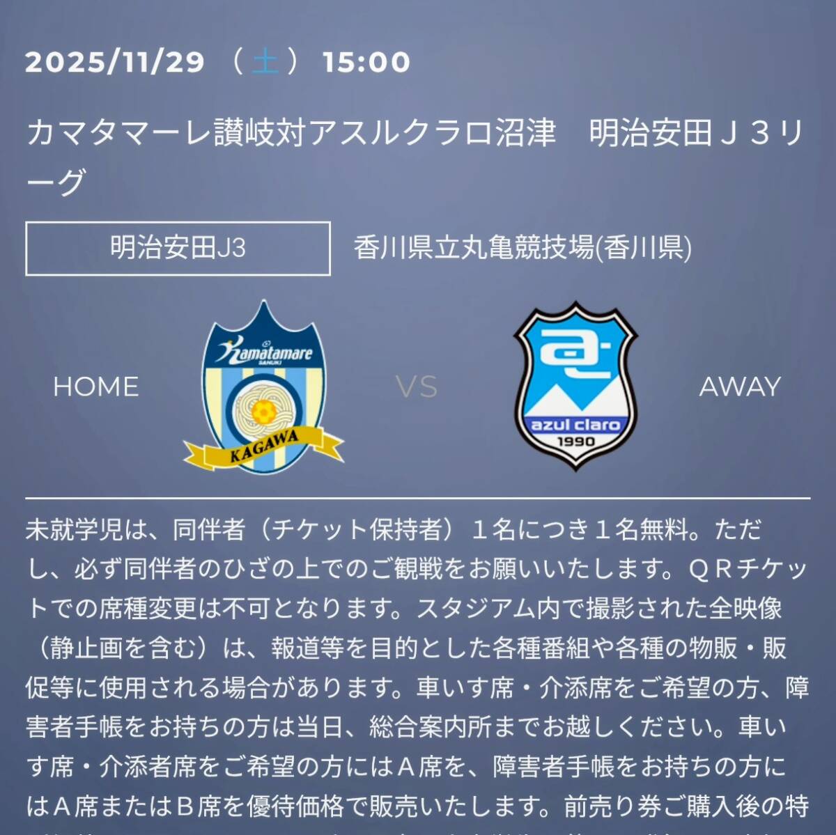 【優待】11/29(土) カマタマーレ讃岐 vs アスルクラロ沼津 メインA席/バックB席が50%割引で購入できるクーポン 招待 QR チケット Jリーグ