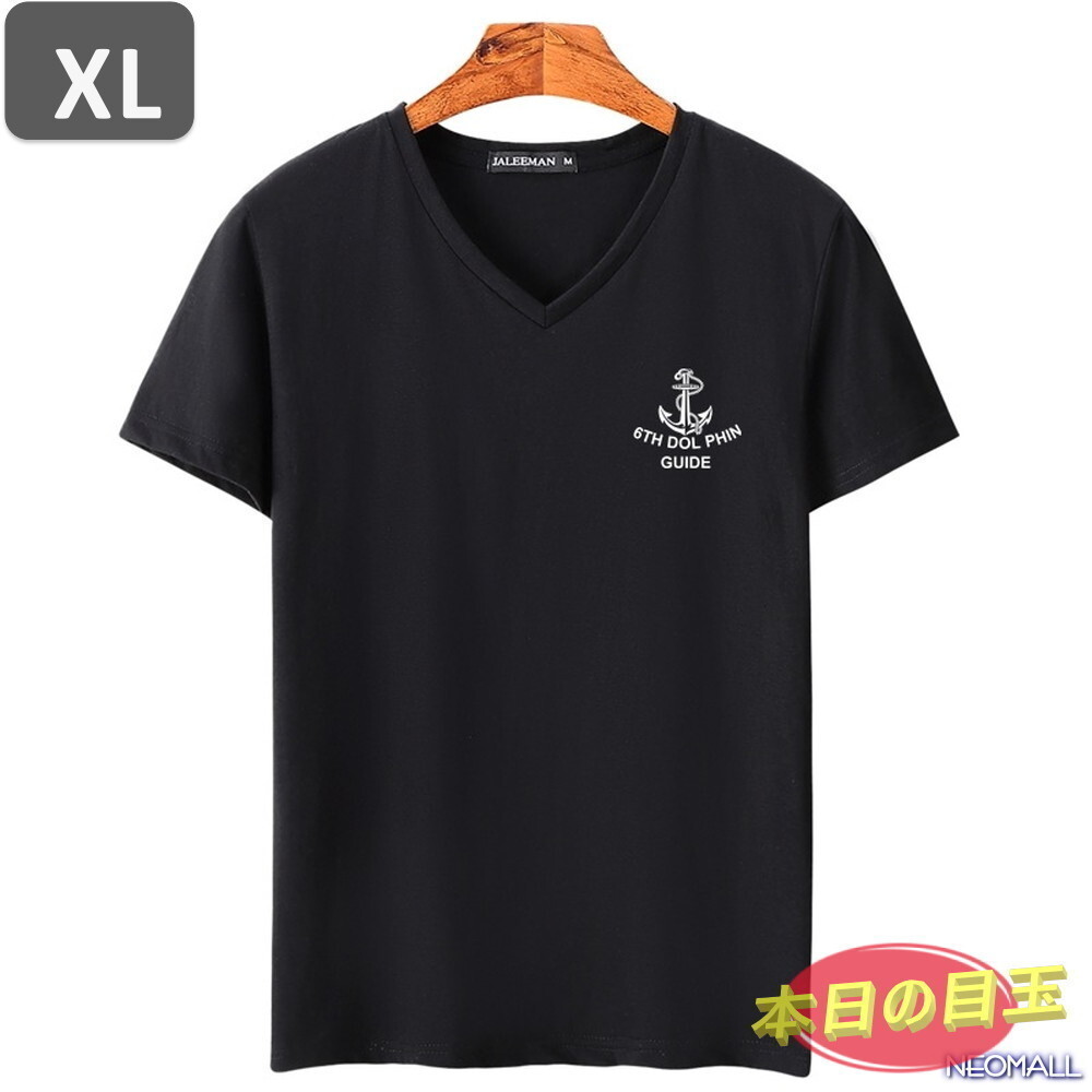 本日のお買得 ☆ Vネック 半袖 Tシャツ【454】 ブラック XLサイズ トップス シャツ シンプル イラスト デザイン 春夏