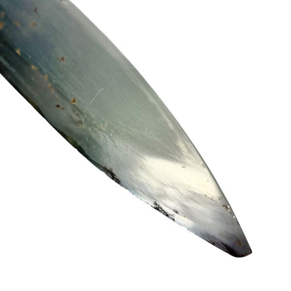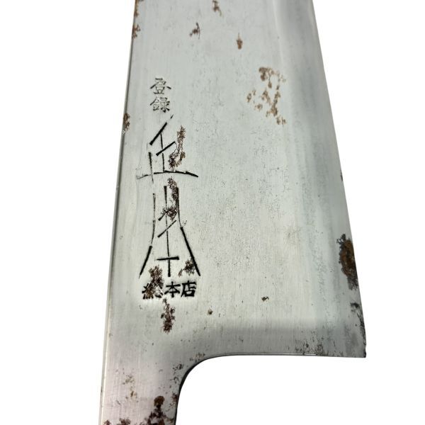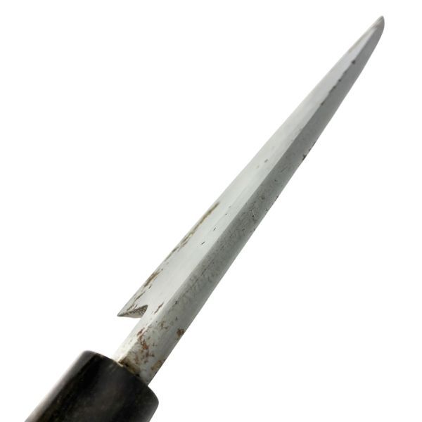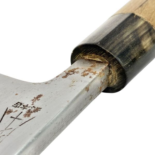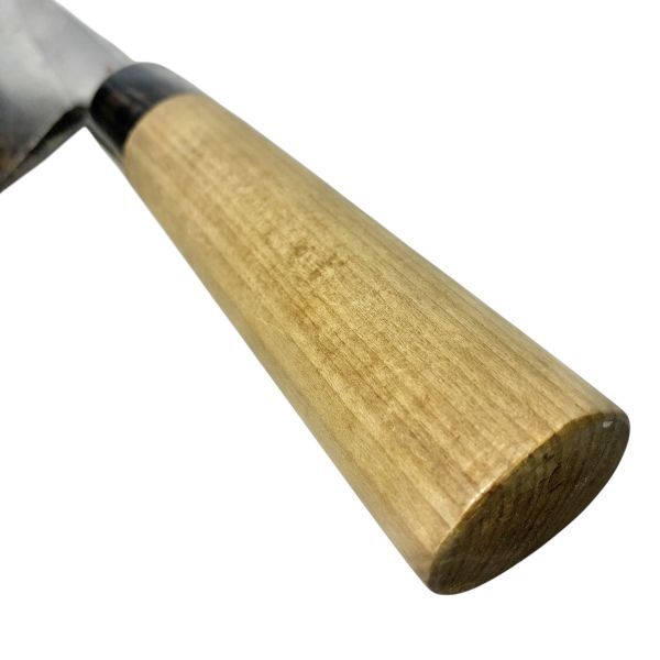 中古現状品です。刃部にスレやサビ、くすみがありますが、刃欠けはなく、研ぎ直しを行えば再び鋭い切れ味を取り戻せます。木柄に使用感が見られますが、がたつきはありません。