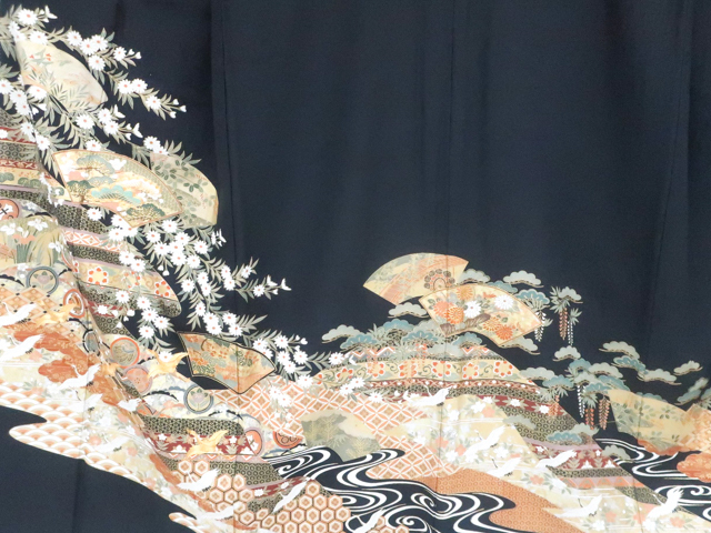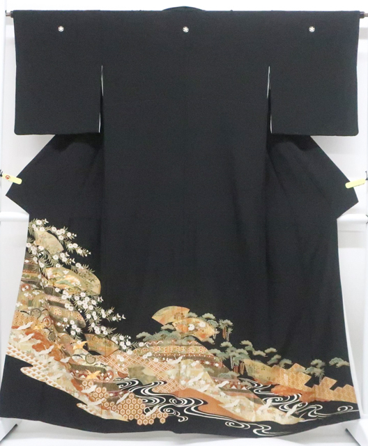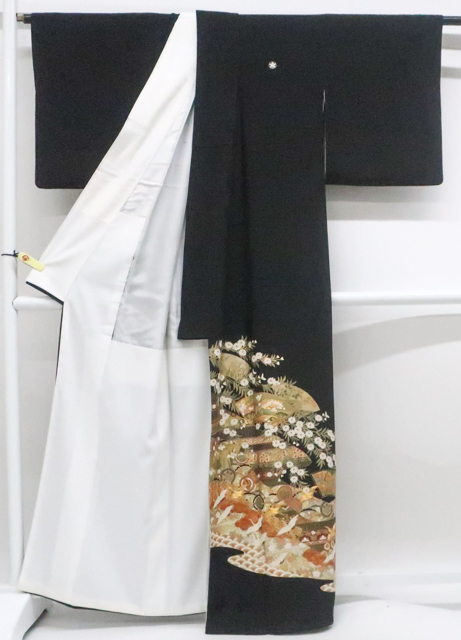 《京都一輝堂》黒留袖 五ツ紋 金駒刺繍 吉祥文 比翼仕立て 正絹 着物 身丈約163.5cm 裄丈約64.5cm 25z11-6201