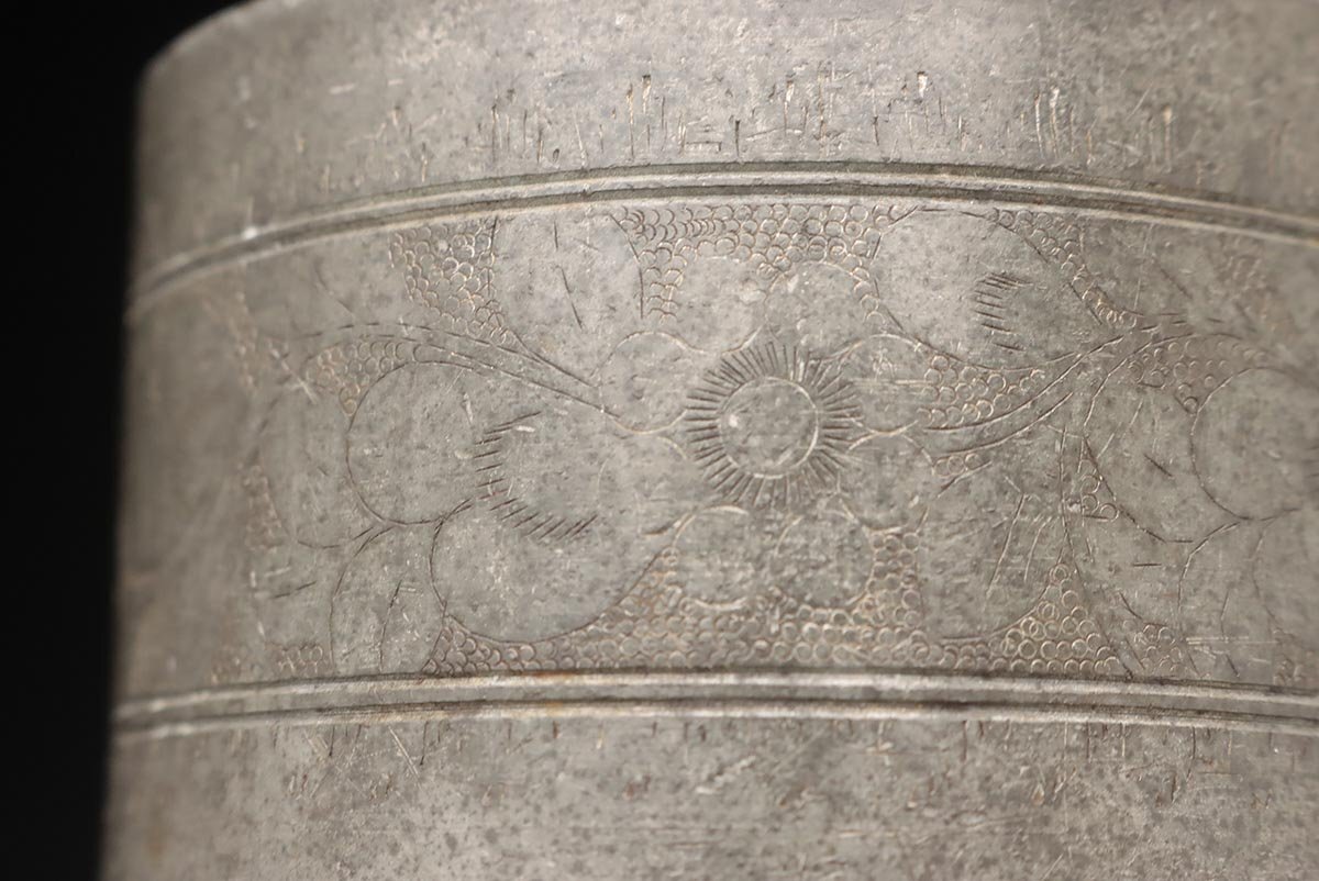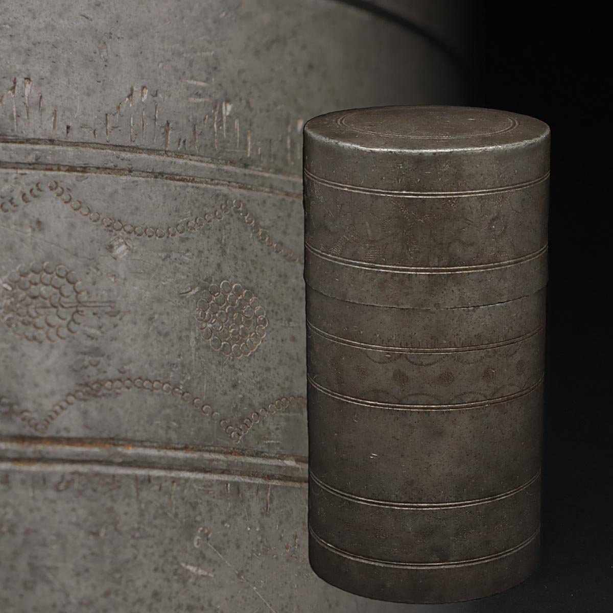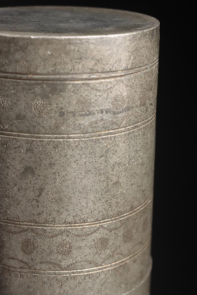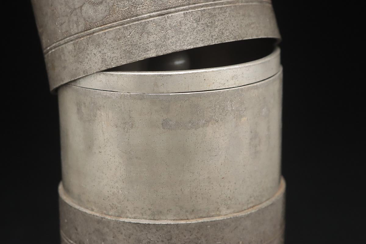 | ◆ 時代 古錫 花唐草彫文 茶筒 高15.5cm / 重945g・茶入・茶壺・茶壷 茶器 煎茶道具 古美術 ◆