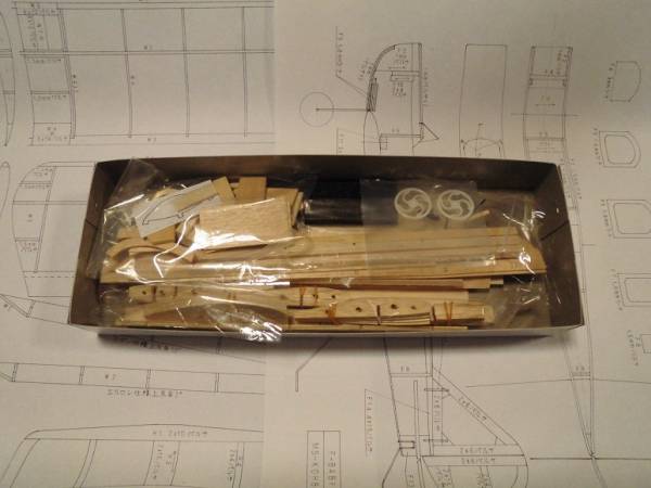 1部を除きカット済バルサパーツ、 シナベニアパーツ、 リンケージパーツ、 ネジ類  25mmメインギアーホイール、A3版図面2枚。