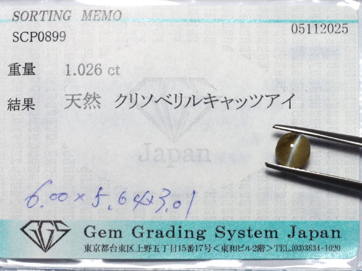 天然クリソベリルキャッツアイ ルース 1.026 ct、ソーティング付き、ケース入り