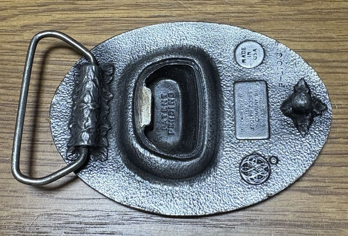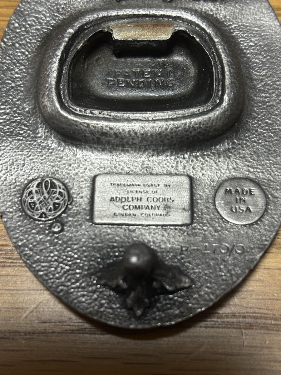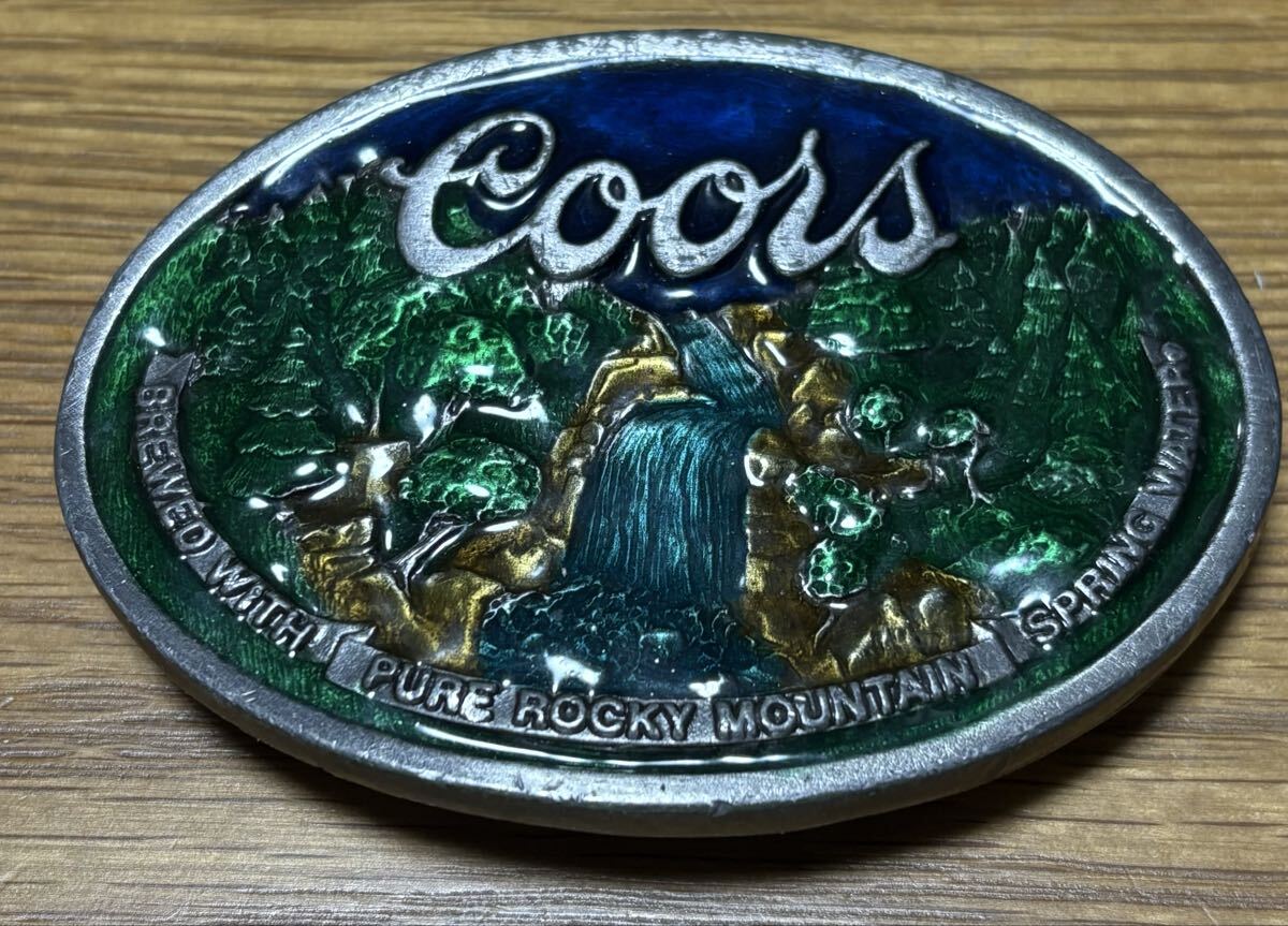 アメリカの名門ビールブランド「Coors(クアーズ)」のビンテージ・ベルトバックルです。重厚なメタル製で、バックル裏面には便利な栓抜き機能も付いたコレクタブルな一品。表面には「BREWED WITH PURE ROCKY MOUNTAIN SPRING WATER」の文字と美しいロッキー山脈のデザイン。USA製の希少アイテムで、ライセンス表記(Adolph Coors Company - Golden, Colorado)も刻印されています。