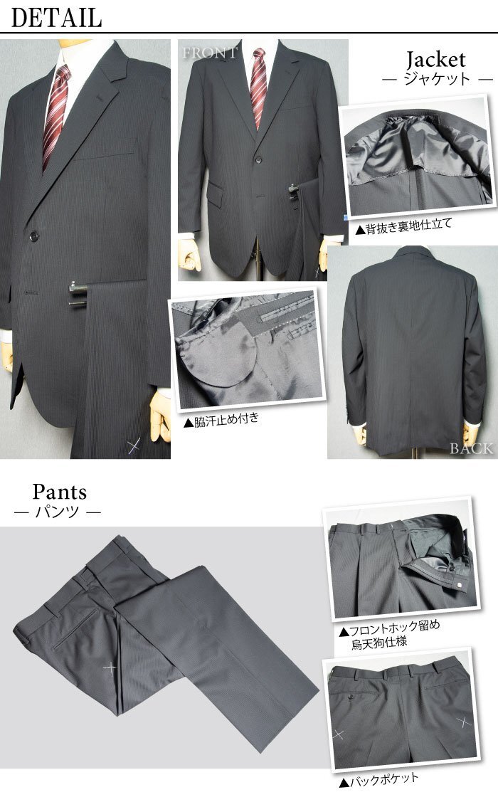 | ジャケット | シングル2ボタン ノッチドラペル 背抜き裏地 センターベント 袖3ボタン ボタンクロス留め 開き見せ仕様 ピンポイントステッチ Dカン 汗止め付き お台場仕立て |