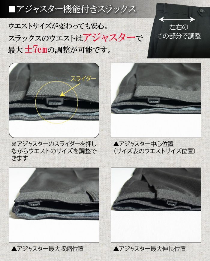 | スラックス | ワンタック フロントホック留め 烏天狗仕様 ウエストアジャスター付き(±約8cm) ヒザ当て付き |