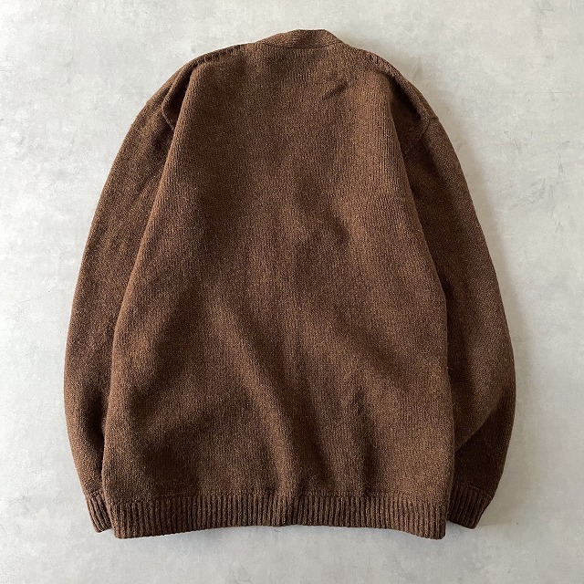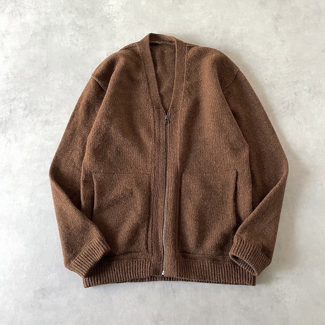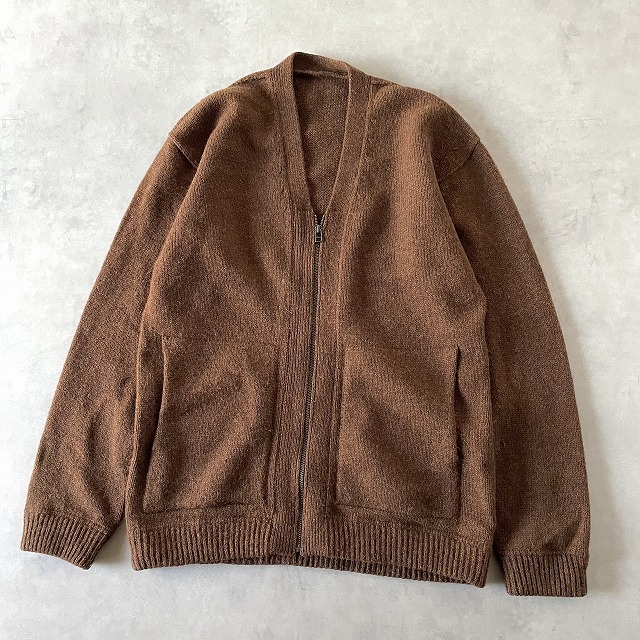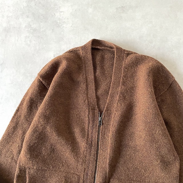 ミドルゲージのシェットランドウール糸を編み立てた、Vネック仕様のジップアップカーディガンになります。
