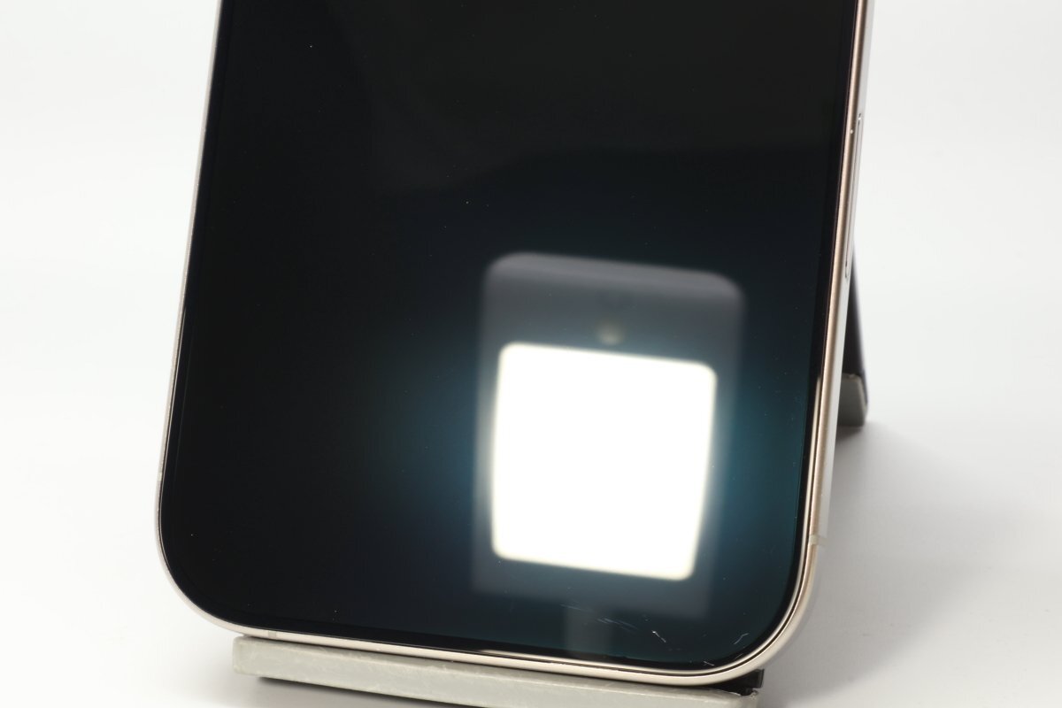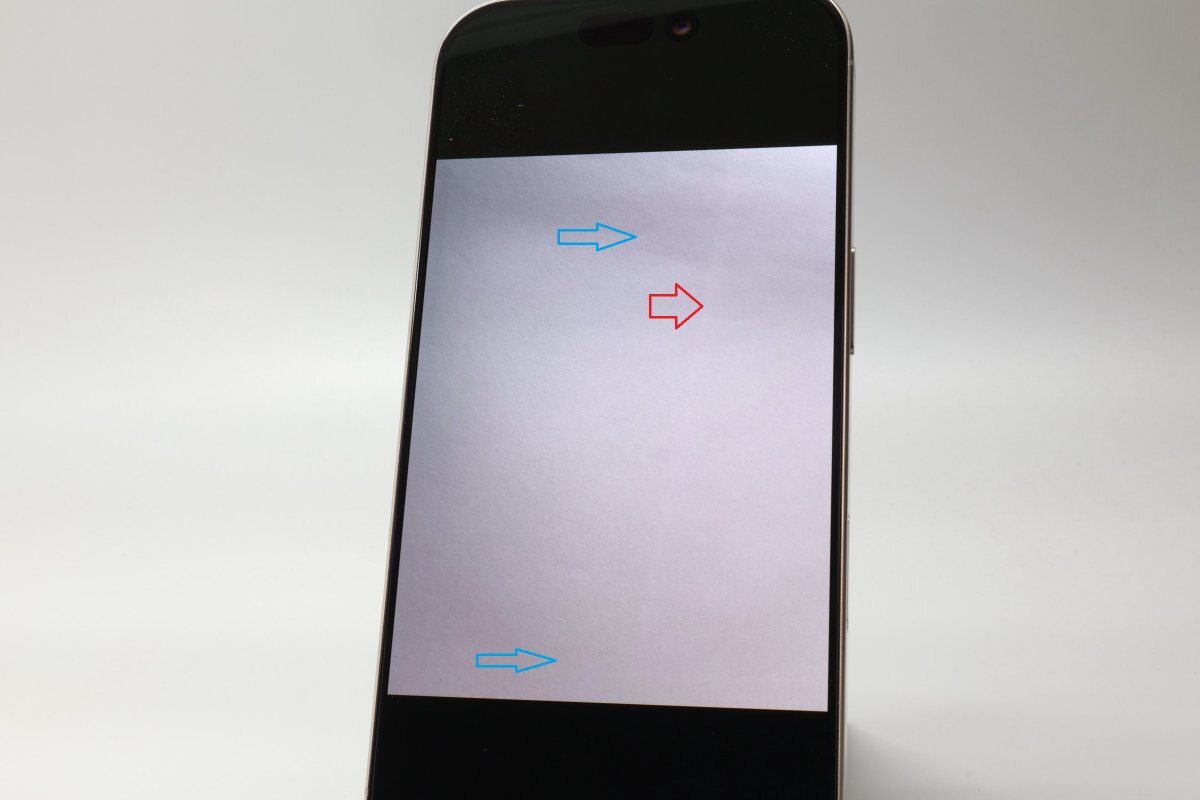 ・インカメラ撮影時、写真ともに縦(赤矢印)と横(青矢印)に光のラインが写り込みます(写真6 ※インカメラで撮影した写真を撮影してます)