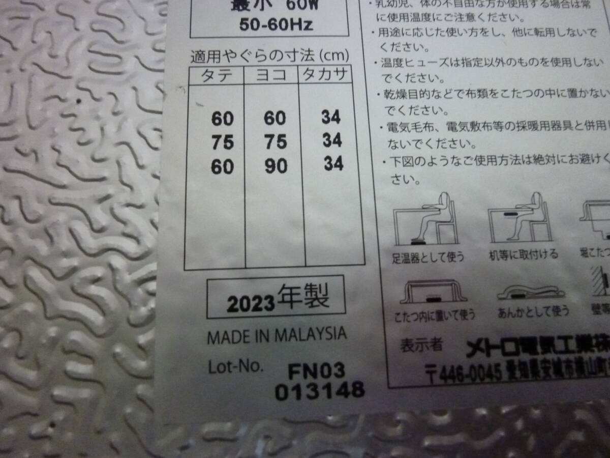 | 商品説明 | 【未使用】 新品未使用のこたつから外された商品です。 裏面アルミ部分に紙のようなものがついています。はがれませんでした。 細かな擦れ傷、 埃混入あります。 キズなど気にならない方の入札をお願い致します。 【ヒーター】メトロ電気工業製 フラットヒーター 型番:MCR-200E 電源:交流 100V 50-60Hz 消費電力:最大200W 最小60W ヒーター:面状カーボンヒーター 1時間あたりの標準消費電力量 ■強:約110Wh/ ■弱:約50Wh サイズ 51X40cm(電源ユニット差込口含む) 温度調節 手元電子コントロール式(連続電力自動制御) 安全装置 温度ヒューズ/電流ヒューズ 電源コード 丸打ちコードタイプ3m 電子コントローラー付 KE21D 取付ネジあります。 使用には問題ありませんが キズなど気にならない方の入札をお願い致します。 保証は、 商品到着日含む7日間です。 過去、動作保証があるにもかかわらず 一方的に悪い評価で連絡する方がいました。 運送時の揺れなどで破損、機能しなくなる場合あります。 店頭購入の保証あり商品でないと ご理解の上で御入札ください。 動作不備の場合、商品返送頂き 確認後の御返金となります。 その場合、商品代金+送料+(振込手数料発生の場合) 別途必要なものはご落札者様でご準備ください。 状態や付属品は写真に写っているものがすべてです。 商品は現状でのお渡しとなります。 写真をご覧いただき、ご理解頂いたうえでご入札をお願いいたします。 必ずノークレーム、ノーリターンでお願いいたします。 画像をご確認の上、ご入札下さい。 商品状態に気になる部分が、ございましたら 質問欄よりご質問下さい。 | |