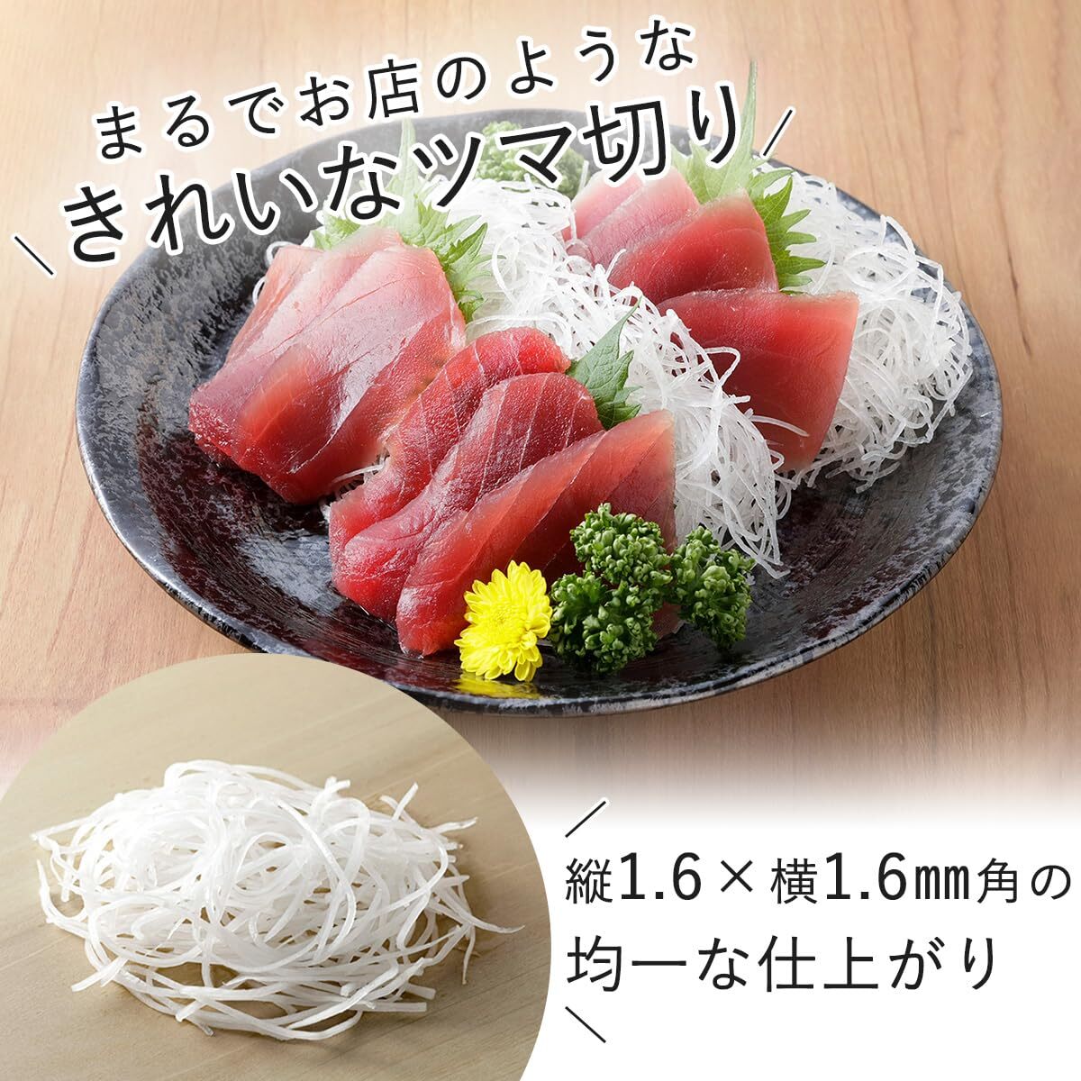 縦のくし刃1本1本に刃付けしてあり、スムーズに切れる 縦横1.6mm角の均一に仕上がる 大根のツマや生野菜サラダにおススメ オールステンレス製で衛生的。食洗機OK