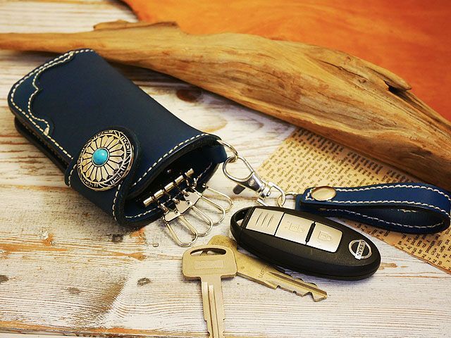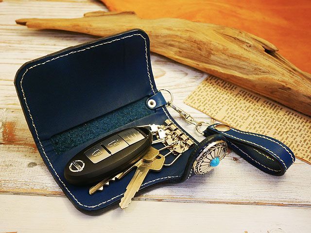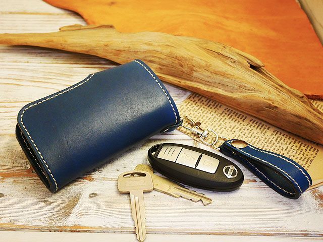 [1点物]牛ヌメ革 本革 フルレザー 手染めヌメ革 レザーキーケース スマートキー ネイビー