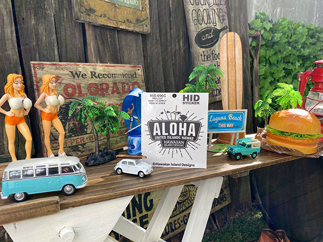 普段愛用してる身近な小物に貼ると、オリジナル・ハワイアングッズに変身するっていう・・・・自分で作る楽しさを体験できるハワイアンロゴのステッカーです。