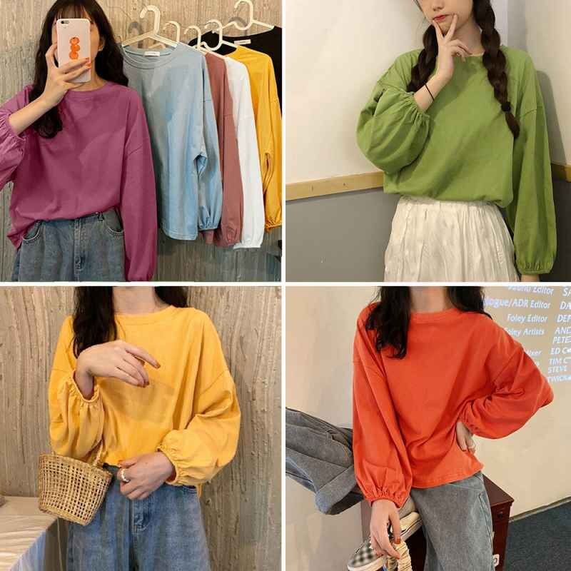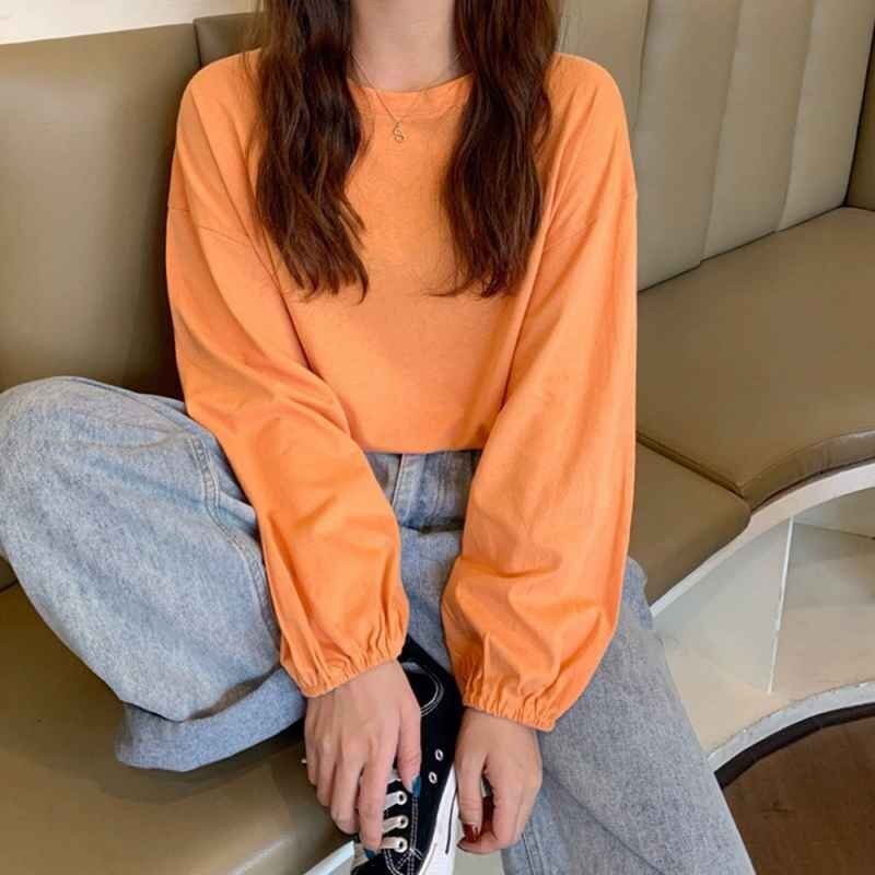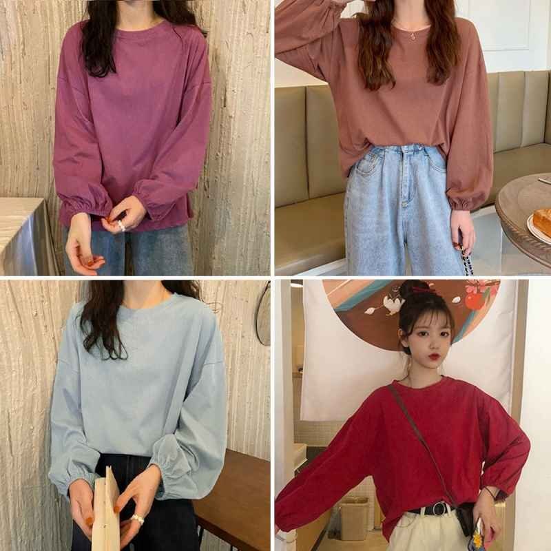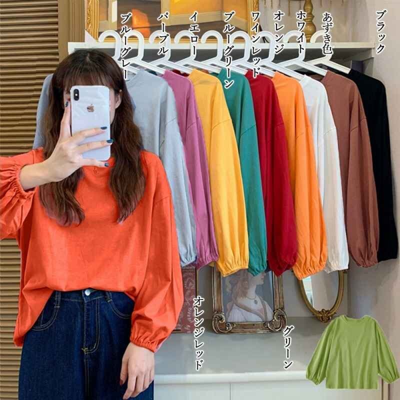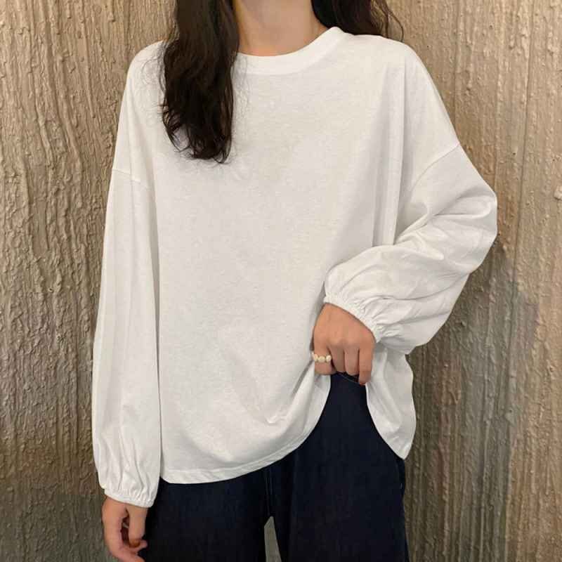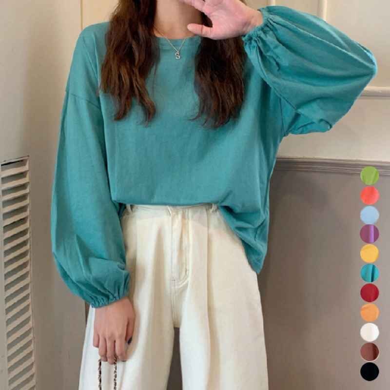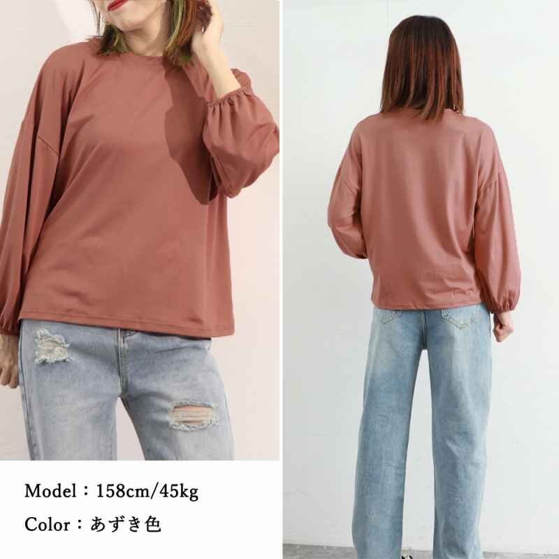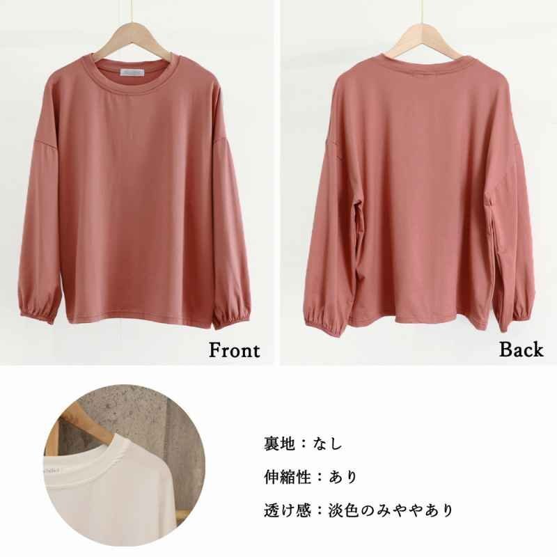 ドロップショルダーにボリューム袖、楽ちんなのに体型カバーできるクルーネック長袖Tシャツです。