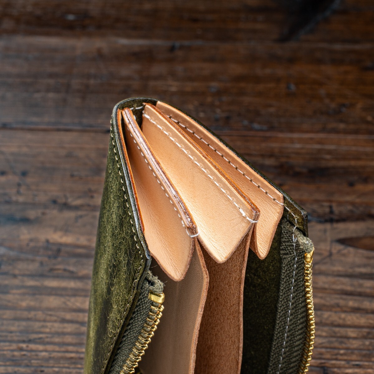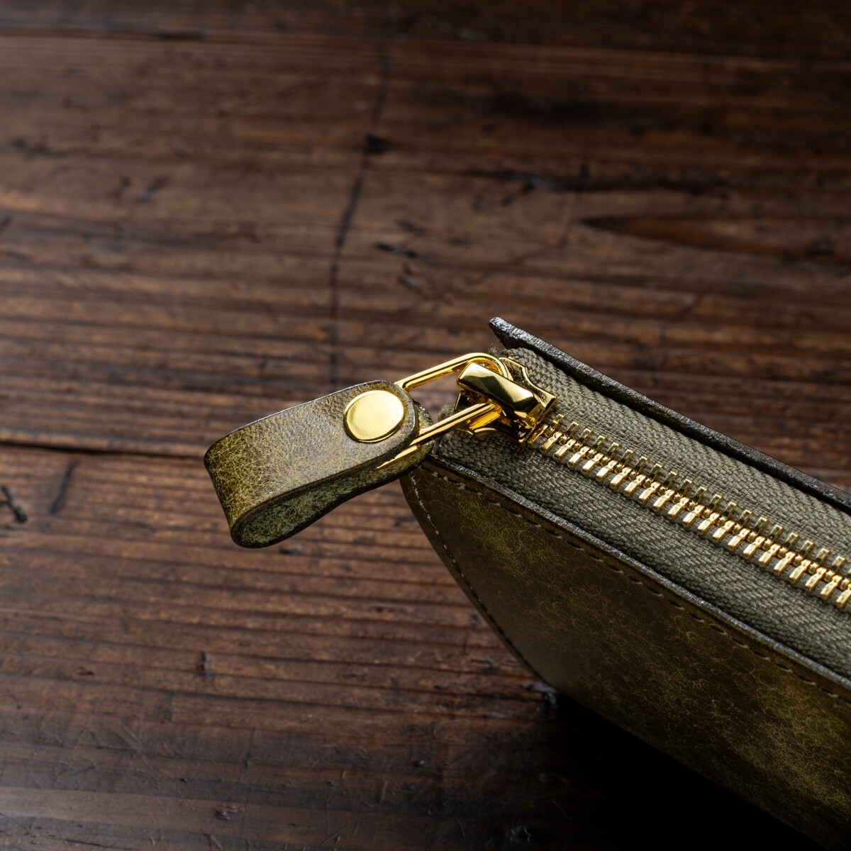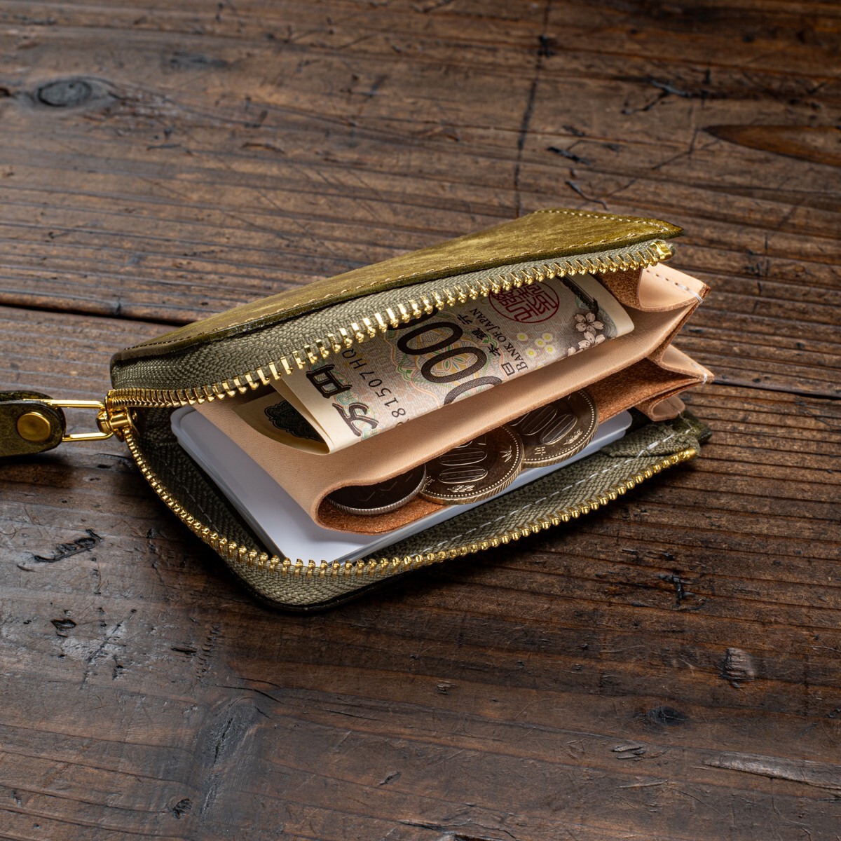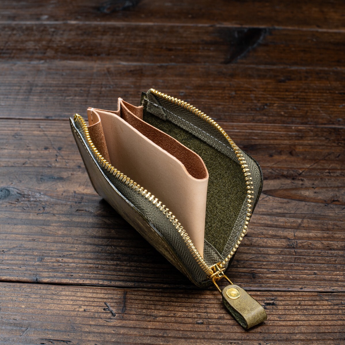 L字ファスナーは開閉がスムーズで、中身を見渡しやすく、カードやお札の出し入れもスムーズです。手にしたときの収まりの良さも魅力で、ポケットにもすっと収まります。