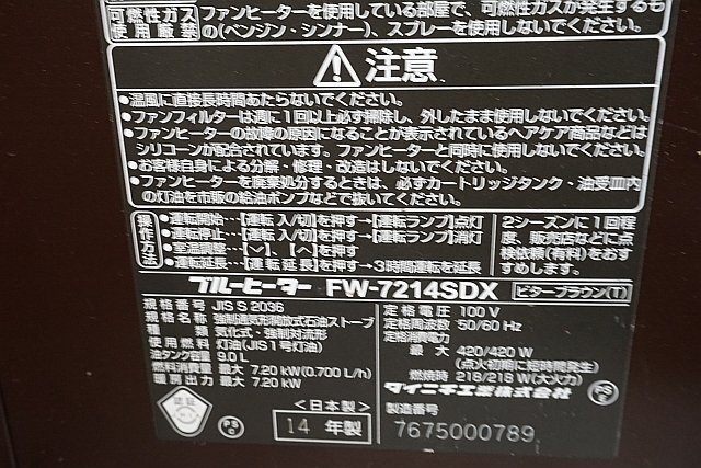 ●◎ ※ジャンク DAINICHI ダイニチ 石油ファンヒーター 9.0Lタンク付(緑キャップ) 100V 2014年製 FW-7214SDX 【送料落札後調整|同梱不可】●
