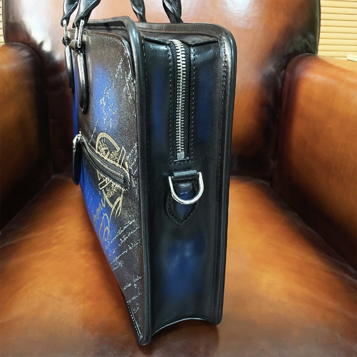 手触り感触が良くアンティーク風なブリーフケースと仕上がりました。角の部分は丸みを帯びた設計になっており、全体的にカリグラフィーとゴールデン/シルバーパティーヌがデザインされております。色艶、柔かさに優れていて高級感溢れる逸品となります。