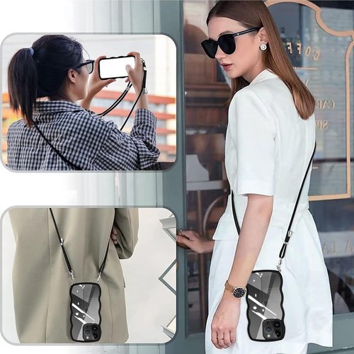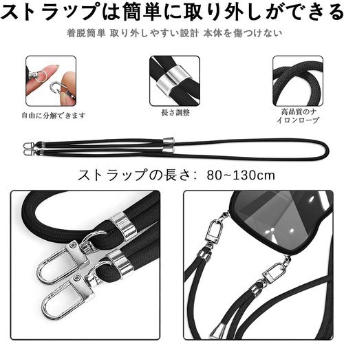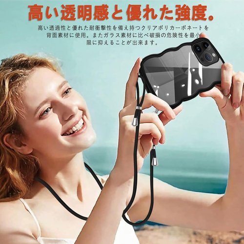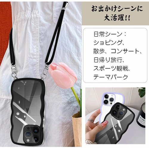 iPhone 15 Pro 用 ケース クリア ショルダー iphone15pro 用 カバー 首掛け 肩がけ 斜めかけ 紐付き ストラップ付き ケース 韓国 可愛い かわいい 透明 薄型 軽量 耐衝撃 シリコン TPU バンパー アイフォン 15プロ 用 スマホケース ブラック 1099