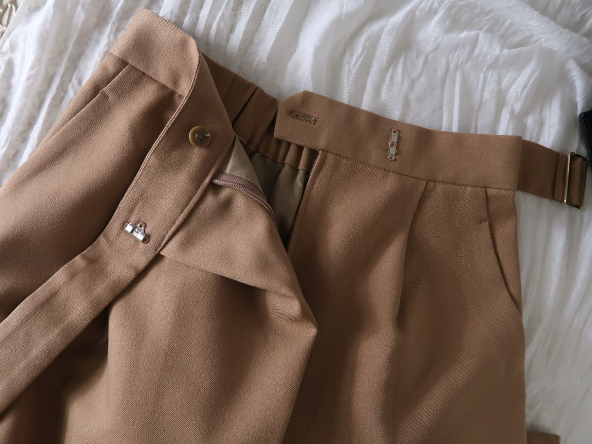 フロントボタンとフックとジップ開閉、両サイドにポケット付き、ウエストバックゴム仕様。