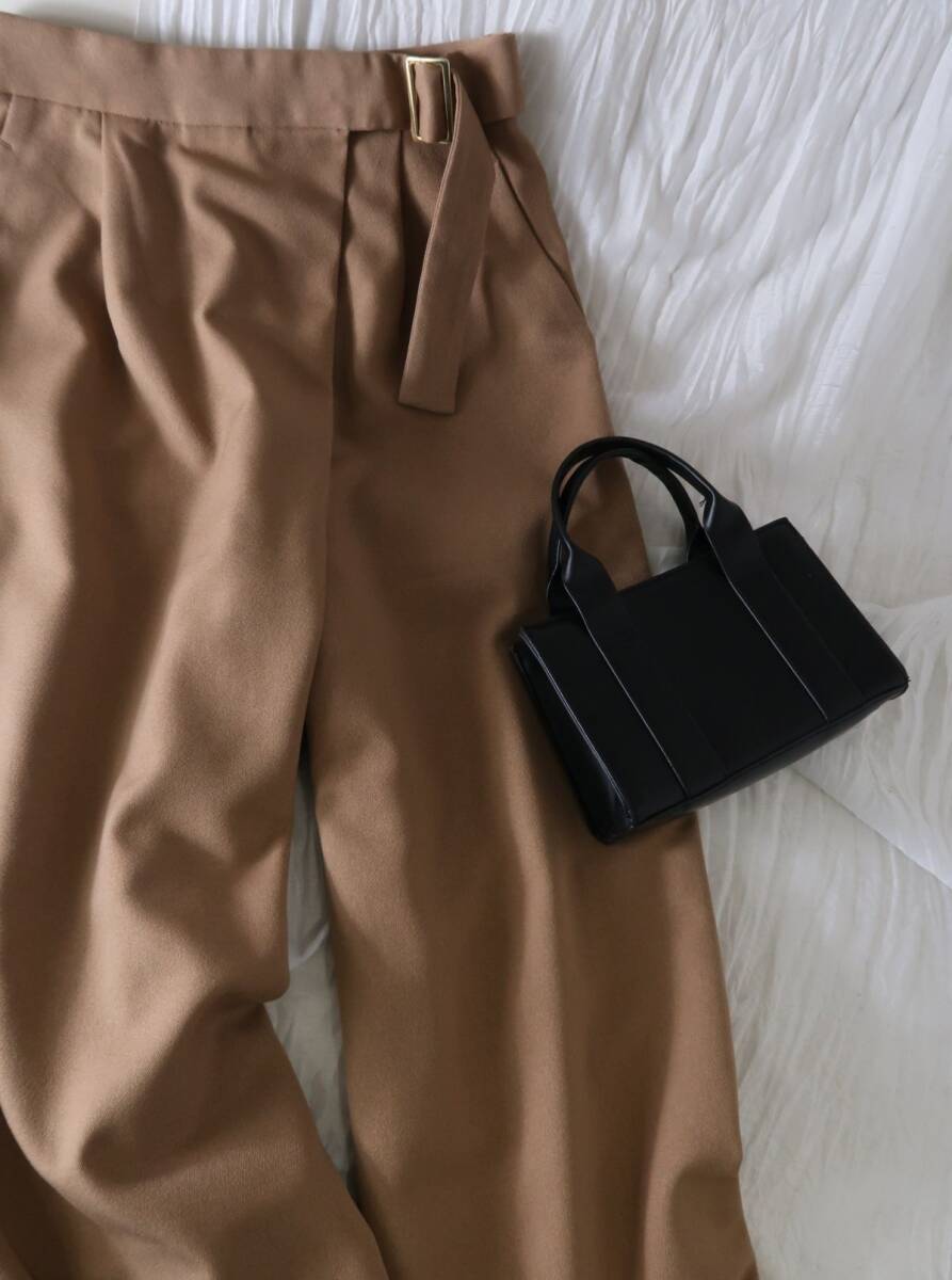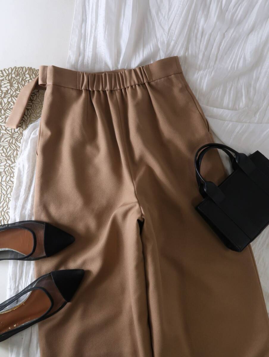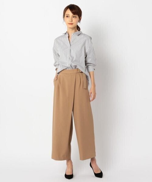 まるでウールのような雰囲気、ウォーム感のある素材を使用したパンツ。ラップ風のデザインとウエストベルトがスタイリッシュなポイント。フェミニンなシルエットで、トップスインした着こなしがきれいに決まります。ワイドシルエットでトレンド感ある着こなしが叶います。ウォッシャブル仕様で自宅で水洗いできるのもポイントです。