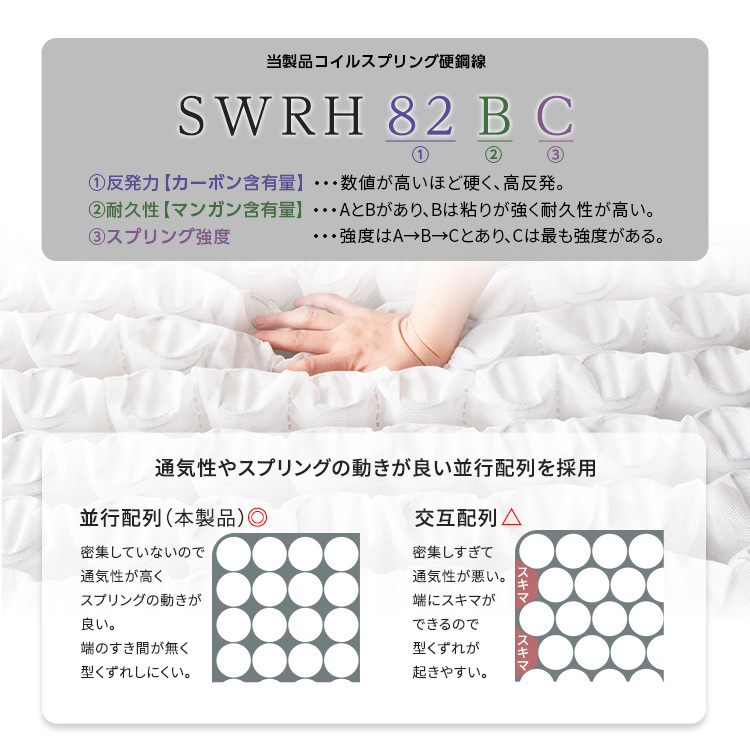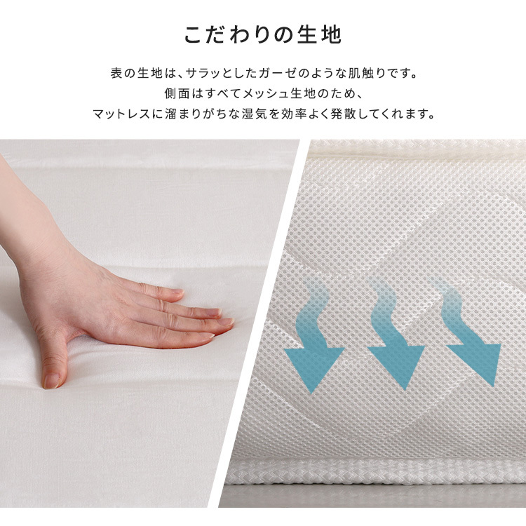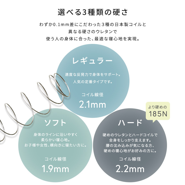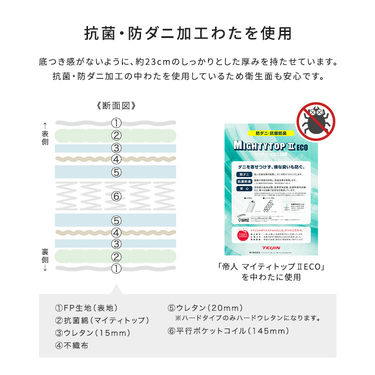 マット中材:ポケットコイル、ウレタン、防ダニ抗菌綿、不織布(ハードにはハードウレタンが入ります)