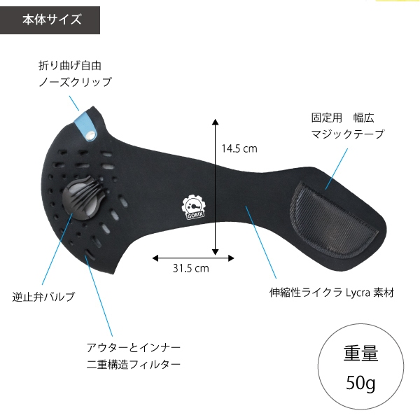 | 外出時、自転車移動、室内、登山やアウトドア、スポーツの際に季節を問わず一年中使用できる便利な各種機能付きマスク。 折りたたんでウェアのバックポケットにしまええるので空気が悪い場面のみ着用するという 仕様方法もありです。 ◎濃密フィルターを通して空気を取り入れ、呼吸の排出には逆止弁バルブを利用して中に留めず排出します。 ◎ハウスダスト、粉塵 等のアレルギー対策としても安心なダストシールドマスク。 ◎室外時での 排気ガス、防塵・防虫、防寒として、汚染された外気から身を守ります。 ◎アウター本体とインナーフィルターの二重構造、アウターを後頭部で固定するので顔への密着性が高い。 ◎折り曲げ自在のノーズクリップ付属で鼻周りの形状にフィット。眼鏡なやサングラスの曇りを抑えます。 ◎伸縮性のあるライクラ素材で、顔にフィットするのでスポーツをしてもズレにくいマスクです。 サイズ:長さ31.5x高さ14.5cm 重量:50g 材質:ライクラLycra + スチレンブタジエンゴム(SBR) ※フィルターのみの単品販売はございません。 | |