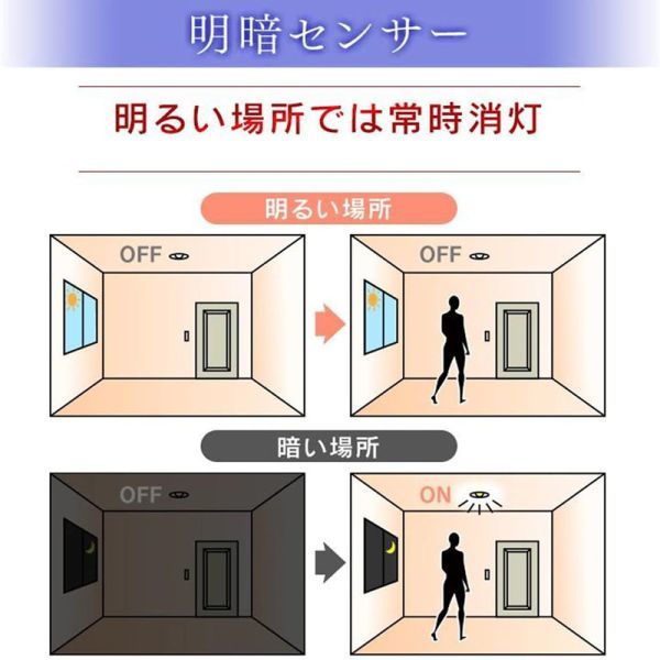 ★自動点灯/消灯: 暗め環境で人が近づくとセンサーが感知 して点灯します。感知エリア内で人が動き続けるとセンサーが感知し続け、点灯時間が延長します。(スイッチを頻繁にON/OFFしても劣化せず、寿命が短くなりません。)