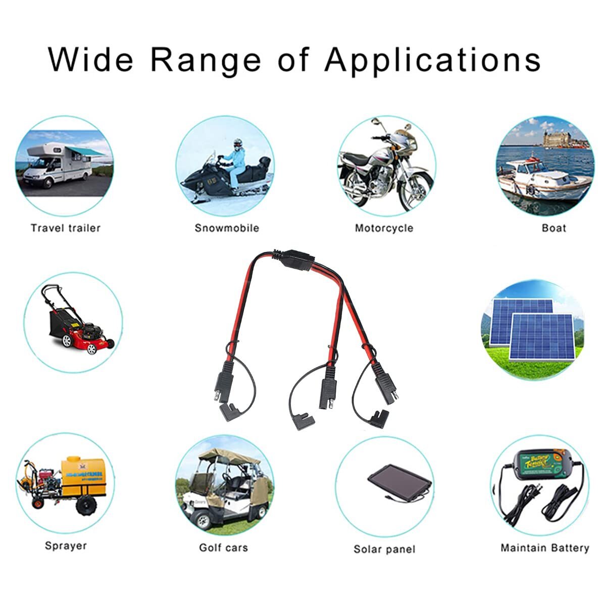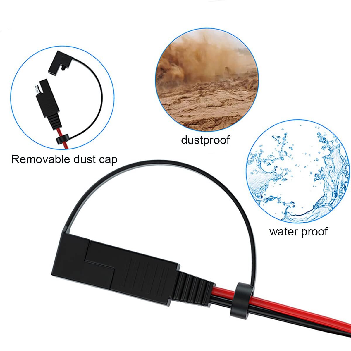 SAEワンポイント2延長コード、SAE-SAEスプリッターシングルヘッドコネクター、ダストキャップ付きSAEソーラープラガブル延長コード。 <br> 入出力電圧:1-36V、最大電流:20A、14AWG <br> PVC素材、フル銅コア。<br> ソーラーバッテリーの接続とトランスミッション、<br>オートバイ、トラック、カーバッテリーのトランスミッションなどに適しています。 <br>防水ダストキャップが付属しており、閉じたときに標準のSAEコネクタを雨やほこりから保護し、使用しないときは内部を清潔で乾燥した状態に保ちます。