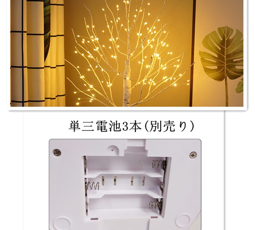 LED電球全144個が枝に搭載していて、寿命は約3000時間で耐用性に優れています。基盤に電池3本を使用するだけで駆動できとても便利です。(電池は付属しておりません)