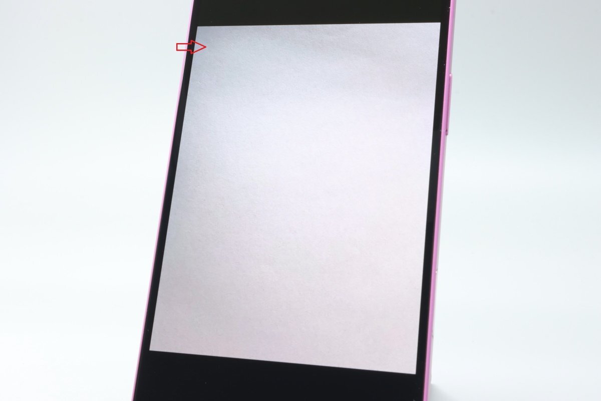 ・インカメラ撮影時、写真ともに縦(赤矢印)に光のラインが写り込みます(写真6 ※インカメラで撮影した写真を撮影してます)