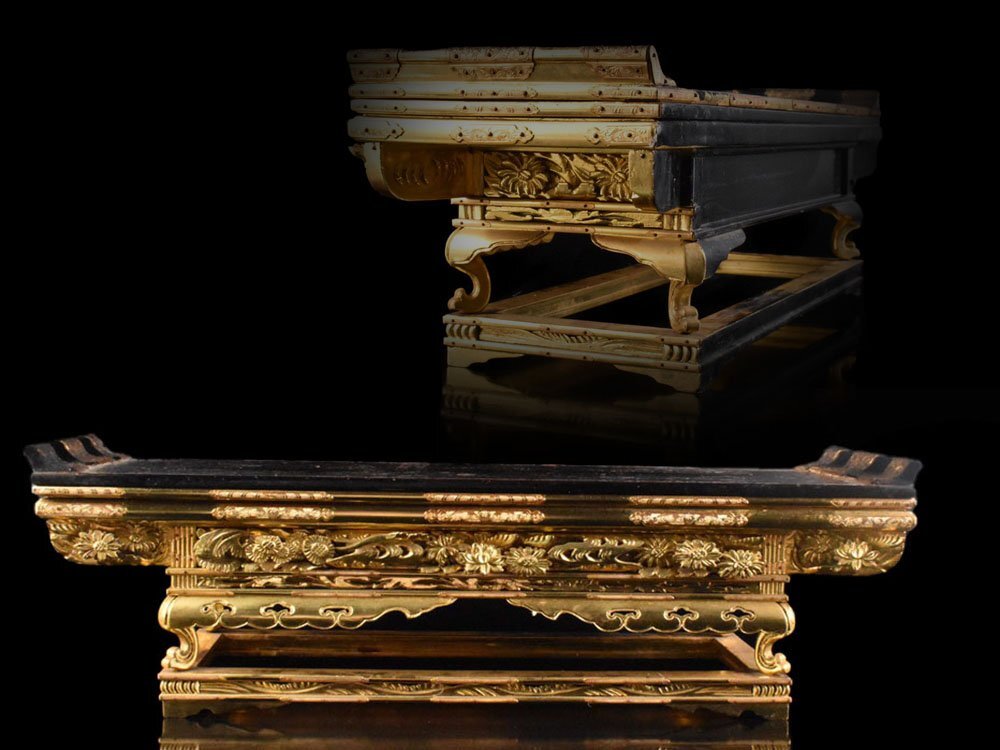 | 商品名 | 【雲】某名家買取品 時代 仏教美術 黒漆 花彫刻 経台 経机 横55cm 古美術品(仏壇前机仏具輪島鍍金)CY2205 OThvndl |
