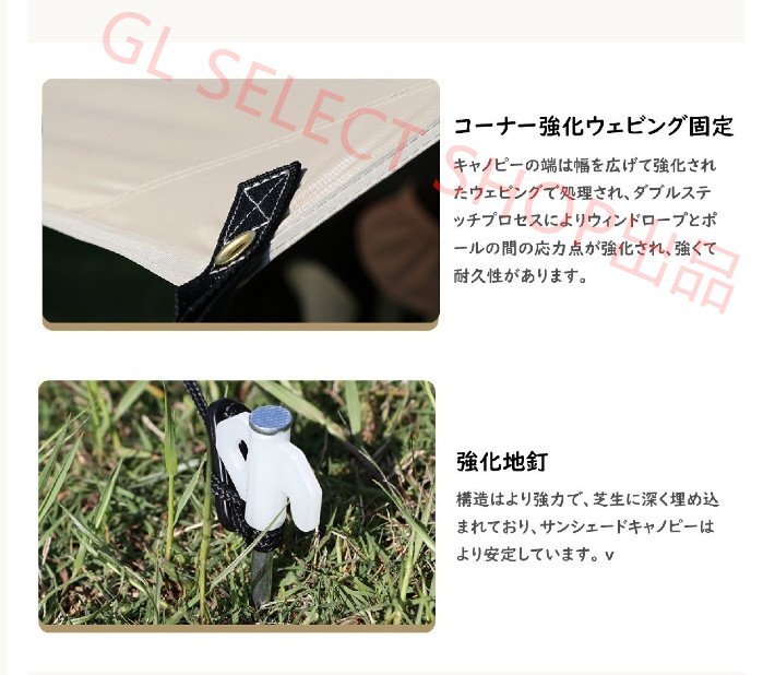 ★コーナーは強化ウェビングで固定され、キャノピーの端は幅広の強化ウェビングで処理され、ダブルステッチプロセスにより、ウィンドロープとポールの間の応力点が強化され、強くて耐久性があります。