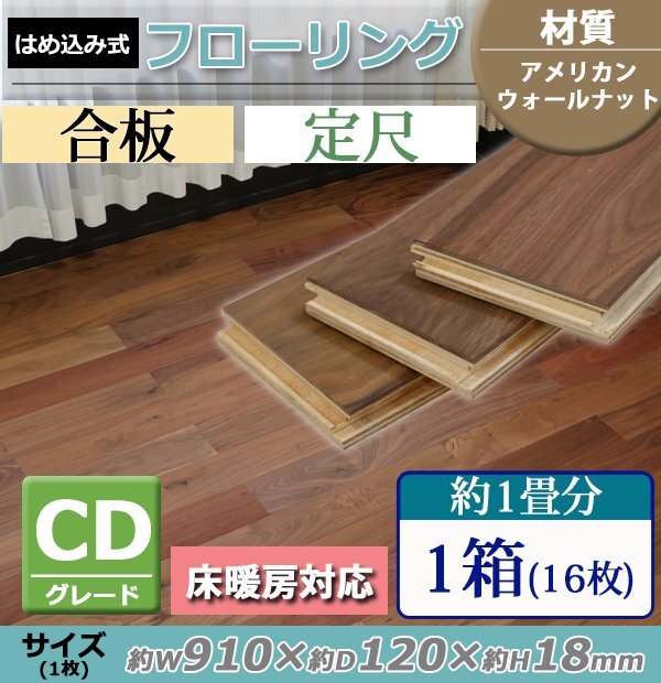 | 商品名 | 送料無料 フローリング 床材 アメリカンウォールナット 簡単施工 合板 JAS認証 CDグレード 定尺 はめ込み 1箱 約1畳分 約1.75平米 16枚 約W910×D120×H18mm 床暖房対応 挽き板 OSMOオイル 2Gクリック フロアタイル 低ホルムアルデヒド 床材 張替え 補修 diy floorewalcd1p |