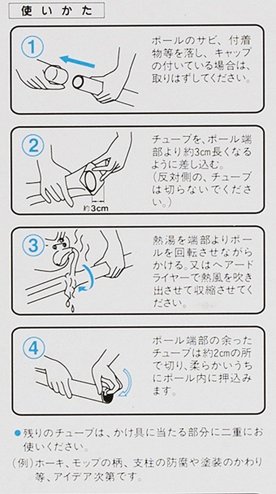 説明 商品紹介 より清潔に竿にかぶせお湯をかけるとピッタリカバー可能! ○物干し竿の修理、腐食の防止、塗装の代わりとして。○ホーキ、モップ等の支柱の防腐や塗装代わりにも○使用できる竿:径約3.8X4.2cm×長さ4mまで。※円形、多角形の棒状のものに使用できます。 商品サイズ(約):74X4500X0.1mm製品重量(約):83g PVC ※1.製品使用は改良のため予告なく変更することがあります。※2.製品の色調は印刷のため多少実物と異なる場合があります。 より ●ものほし腐食の防止に ●竿にかぶせお湯を掛けるとぴったりとカバーできる ●説明書をよく読んでからご使用ください。
