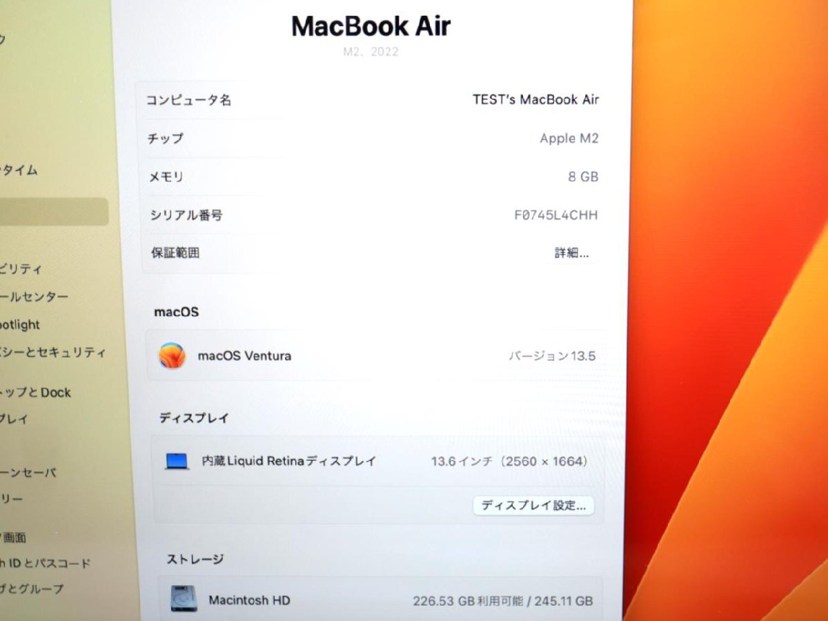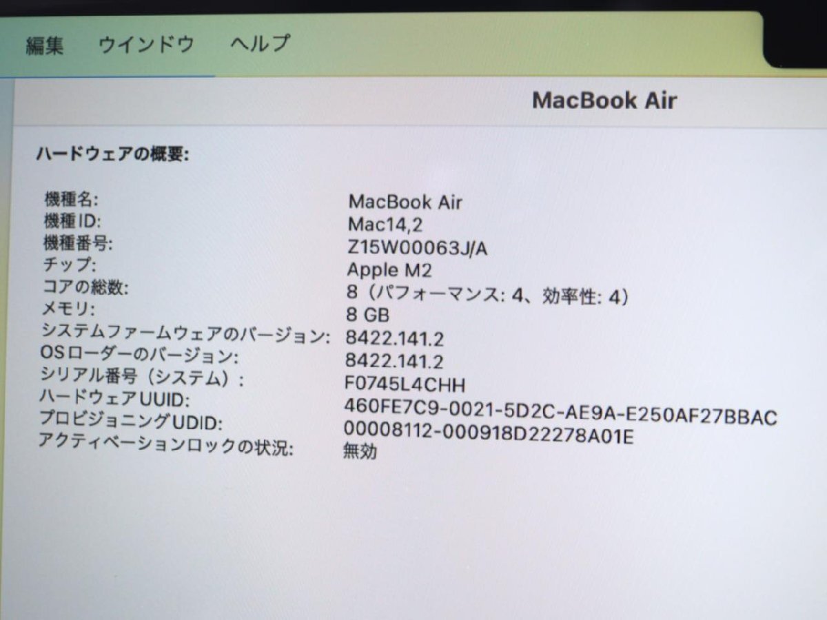 | 商品説明 | 付属品 ■30W USB-C電源アダプタ ■USB-C - MagSafe 3ケーブル(2 m) ■マニュアル ■緩衝材/外装箱 商品説明 使用感が少なく非常にきれいな状態です。 (テストパスワード=0000) バッテリィ最大容量表示=100%です。 充放電回数=4回 ※入荷時の状態となります。 APPLE [USED]u058116 Z15W00063 の 商品仕様1: 発売時期:2022年 7月 CPU : Apple M2チップ 8コア メモリ容量 : 8GB メモリ規格 : -- 液晶サイズ : 13.6 インチ 解像度 : 2560x1664 ディスプレイ : Liquid Retinaディスプレイ ストレージ容量 : SSD 256GB ビデオチップ : Apple M2チップ / 8コアGPU / 16コアNeural Engine ビデオメモリ : -- インターフェース : Thunderbolt/USB4 Type-Cx2、MagSafe 3 その他 : Webカメラ/Touch ID 駆動時間 : 15 時間 無線LAN : IEEE802.11a/b/g/n/ac/ax Bluetooth : Bluetooth 5.0 サイズ(幅x高さx奥行) : 304.1x11.3x215 mm 重量 : 1.24 kg インストアJAN:2200000581167(u058116) |
