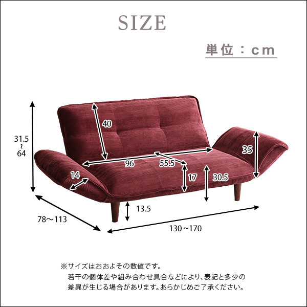 【サイズ】 W130~170xD78~113xH31.5~64cm 【重量】 15kg 【梱包】 サイズ:125x50x63cm、重量:16kg 【カラー】 ベージュ、ブラウン、グリーン、ネイビー、レッド、イエロー 【素材】 生地:ポリエステル 91%、レーヨン 9% 構造部材:スチールパイプ、ポケットコイルスプリング 脚:樹脂脚 中身:ウレタンフォーム 【その他】 カバーは取り外し不可 日本製(カバーは中国製) 【完成品】 脚のみ取り付け。 【ご注意】 ・サイズ、重量は概算です。 ・商品カラーはご使用のモニターによって実際の明るさや色と異なって見える場合がございます。 |