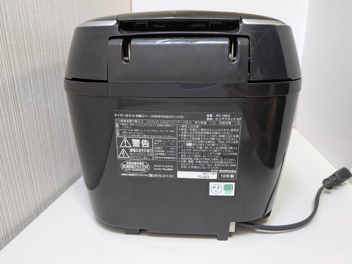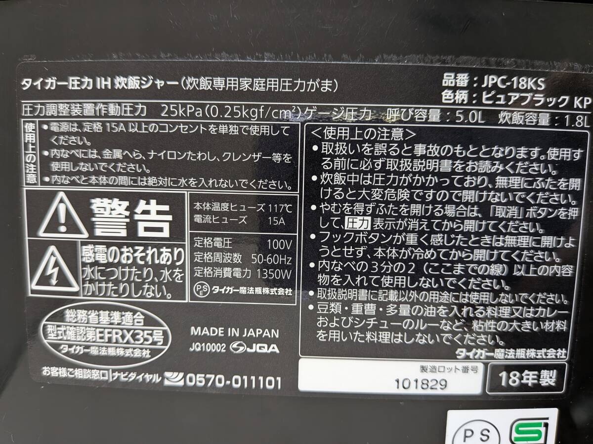 (オ466)JPC-18KS-KP TIGER タイガー圧力IH炊飯ジャー 炊飯器(10合炊き)2018年製 通電確認済み 中古品