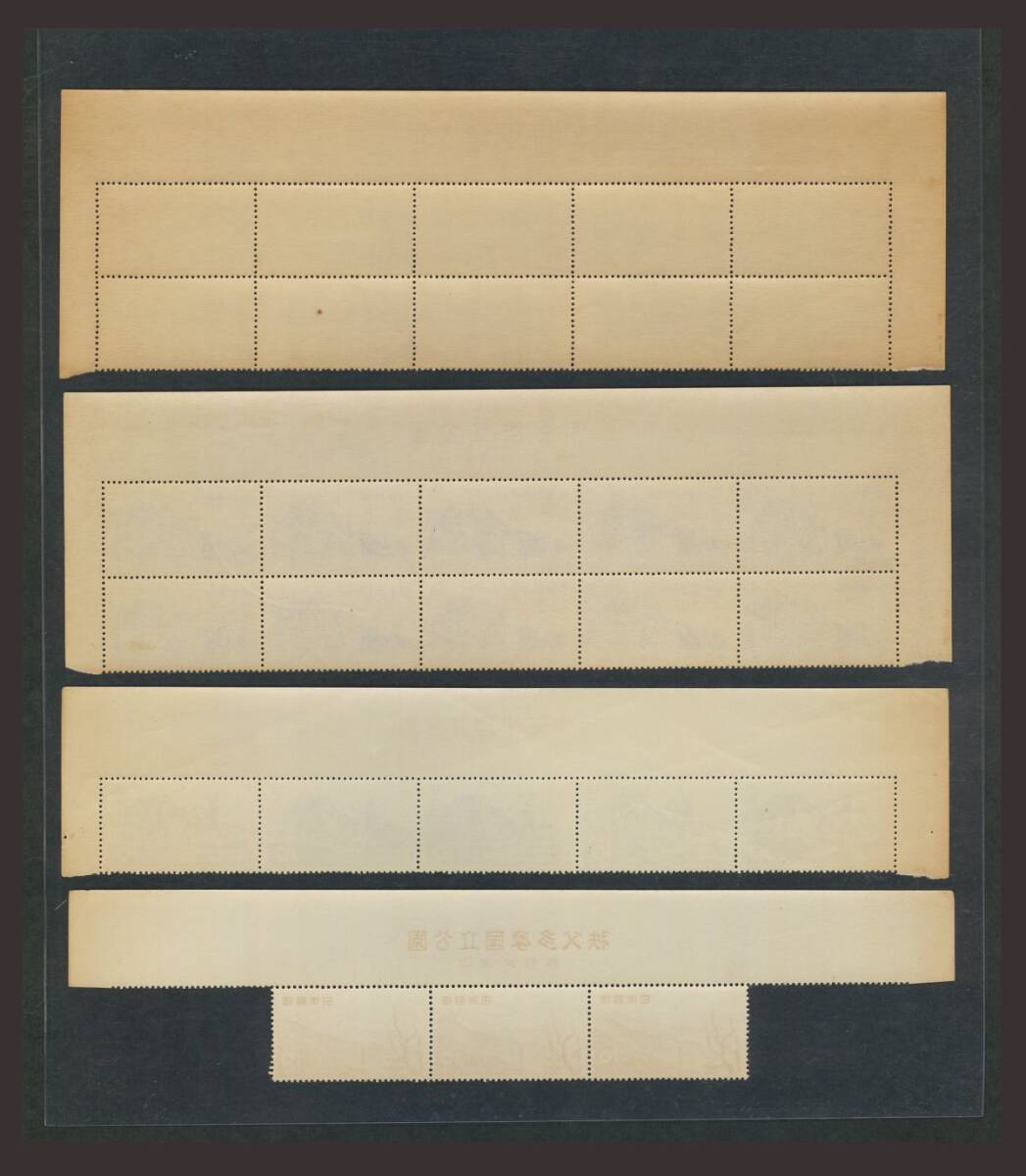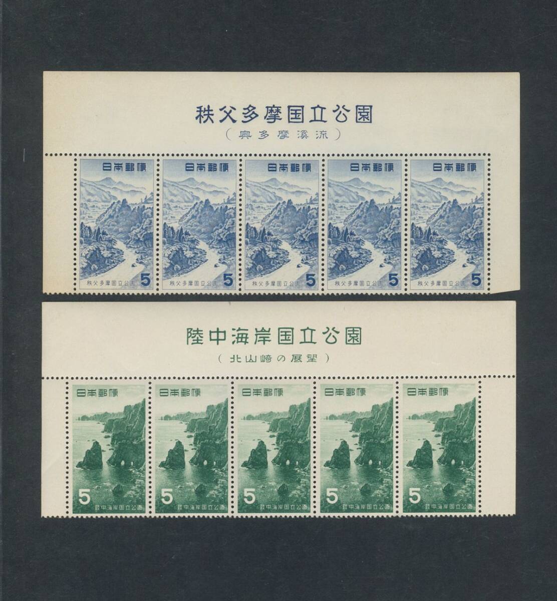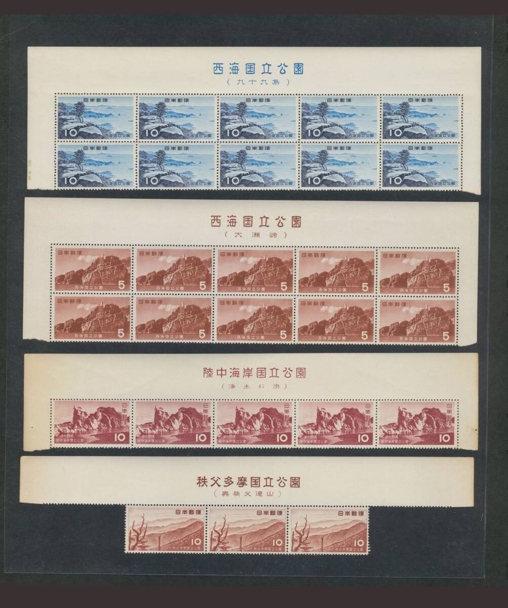 日本切手 国立公園 題字付6種(10枚ブロック×2、5枚ブロック×3、3枚ブロック×1)未使用 シミ、ヤケ有