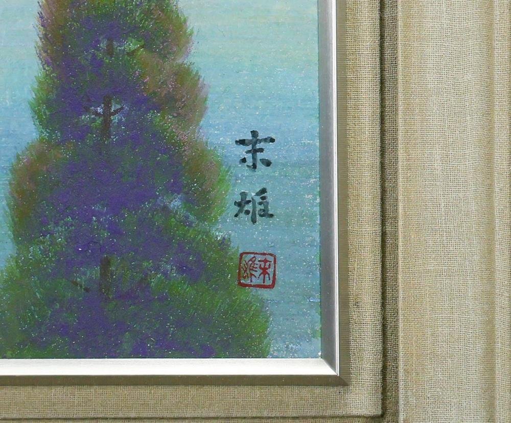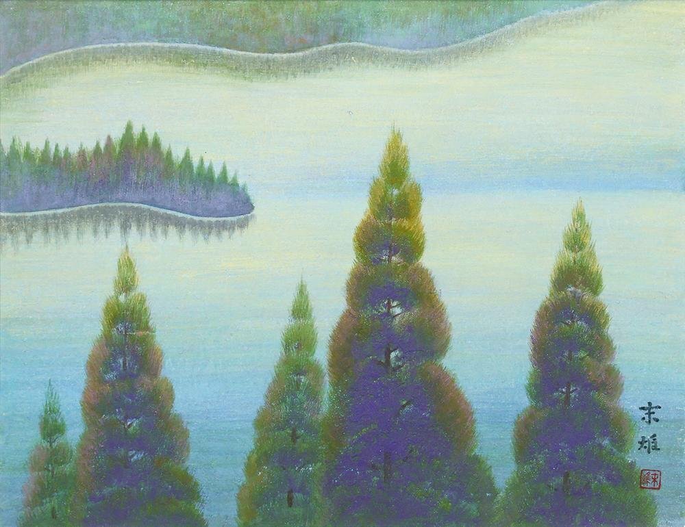 【真作】【WISH】川本末雄「山湖」日本画 6号 金泥仕様 共シール ◆静寂を映す湖畔の木立   〇日展参事 日本芸術院賞恩寵賞 #25112051