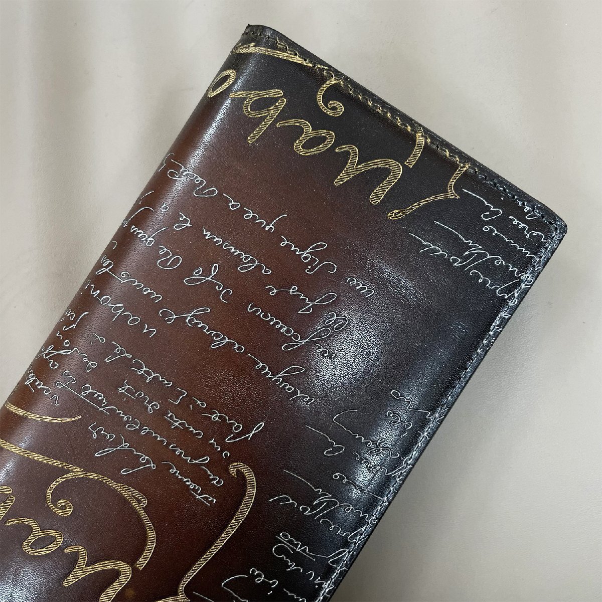 手触り感触が良くアンティーク風な財布と仕上がりました。角の部分は丸みを帯びた設計になっており、全体的にカリグラフィーとゴールデン/シルバーパティーヌがデザインされております。色艶、柔かさに優れていて高級感溢れる逸品となります。